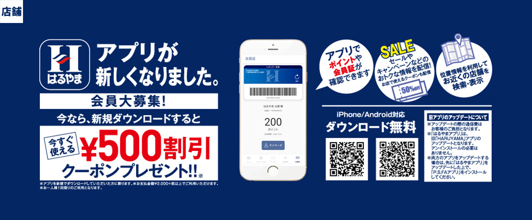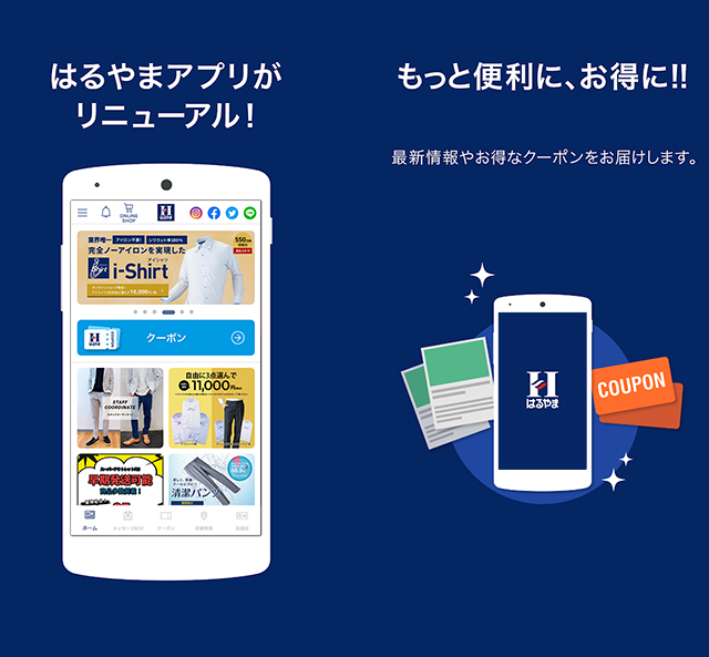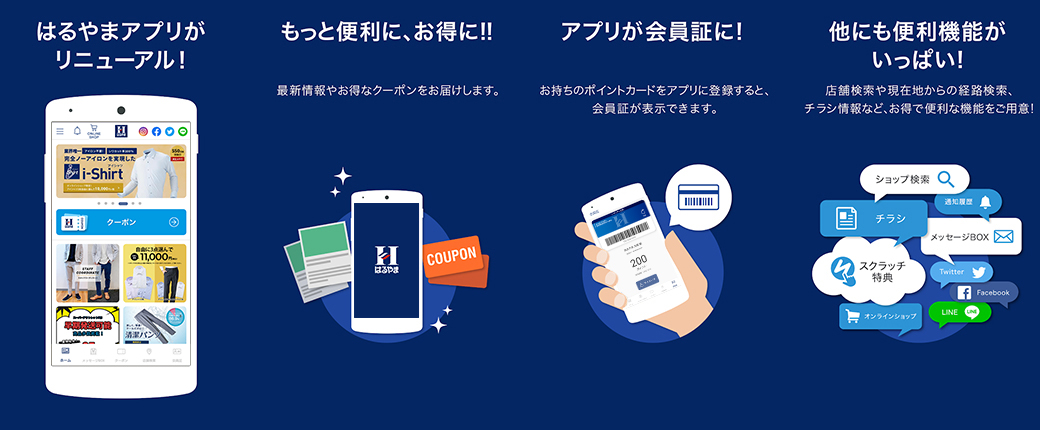 はるやま公式アプリは、会員証の表示やオンラインショップがご利用いただけるほか、最新ニュースがご覧いただけます。
