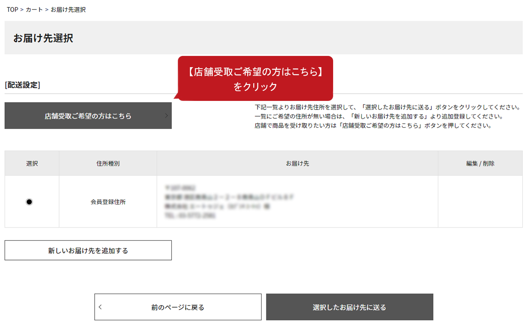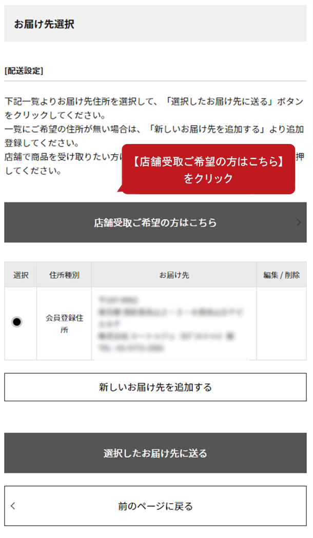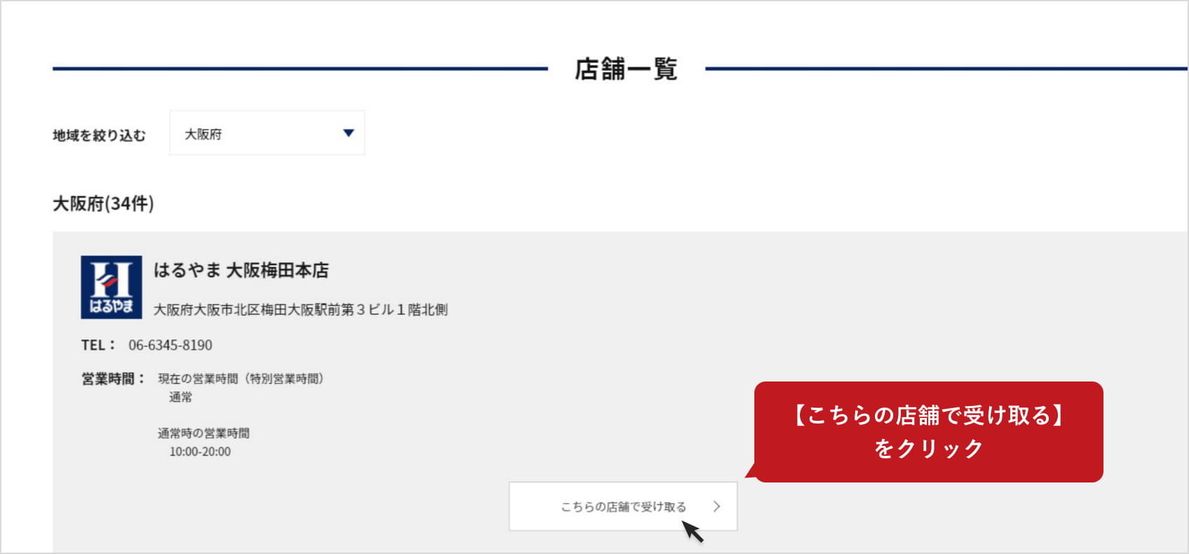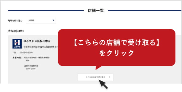 受け取りたい店舗を選びこちらの店舗で受け取るをクリック
