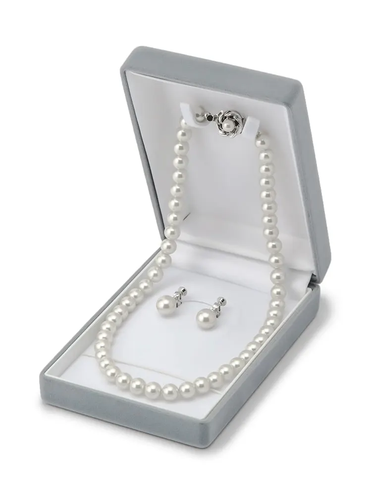 女性の冠婚葬祭行事に欠かせない、パールネックレスとイヤリングのセット。慶びの日にも悲しみの日にも取り入れられる、品の良さとベーシックさを併せ持った一品です。硝子パールを使用しており、程よい艶感が表情を美しく引き立ててくれます。こちらは清潔感溢れるホワイトカラーです。