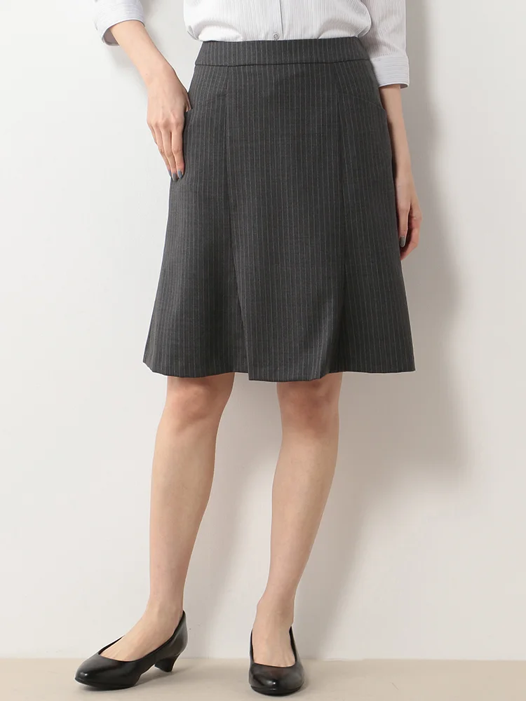 【ウォッシャブル】ポケット付 切替フレアスカート ストレッチ グレー ストライプ 通年【レディース】