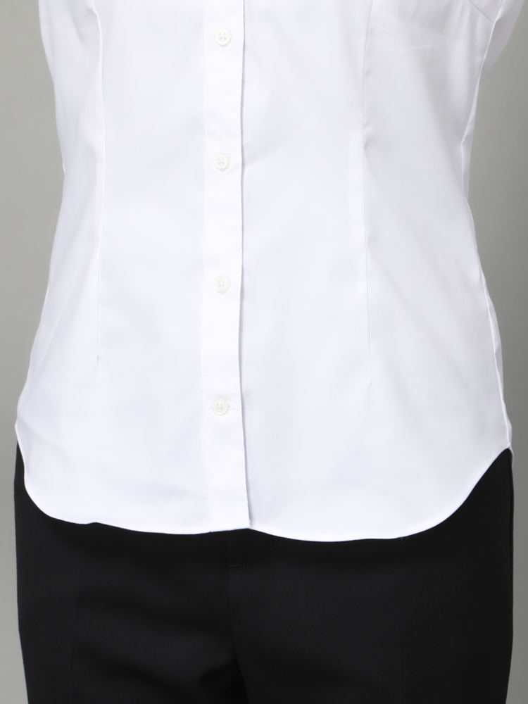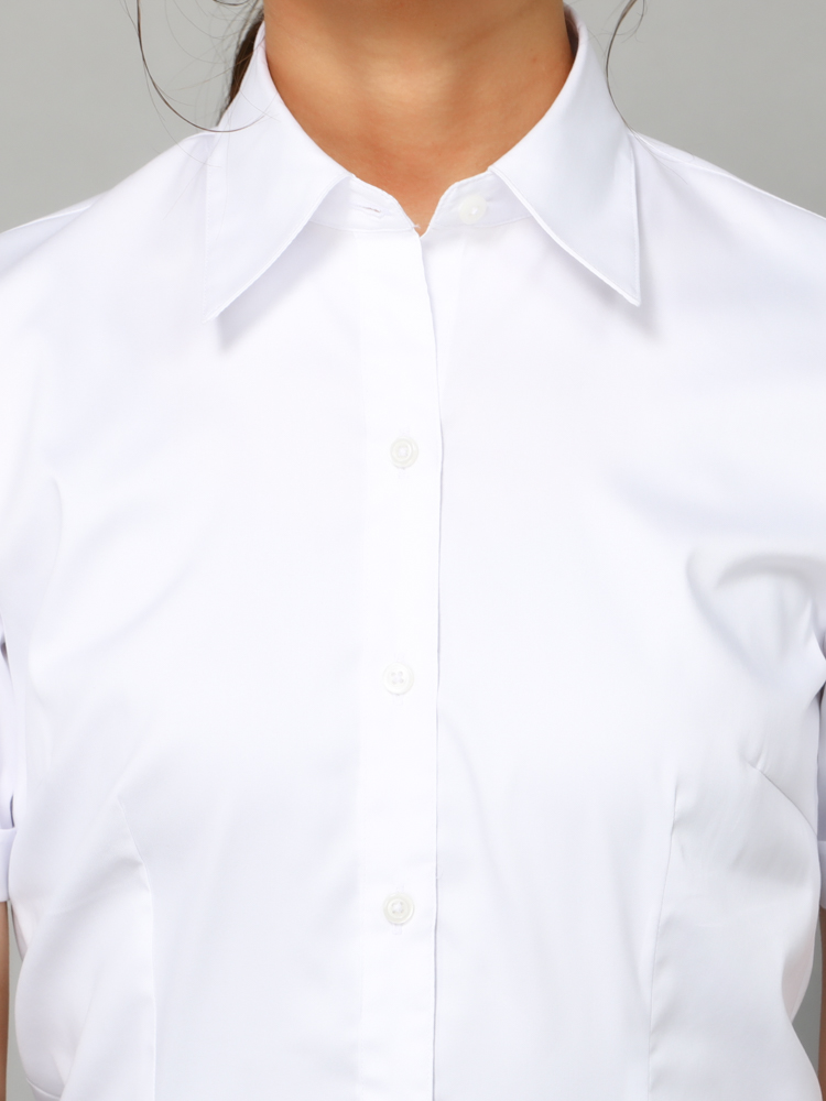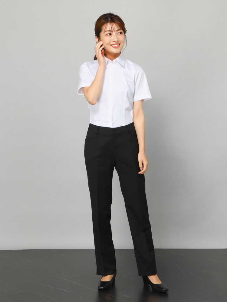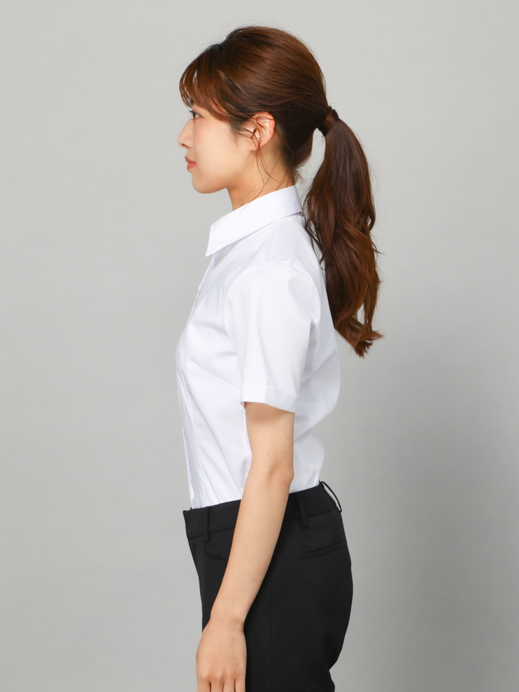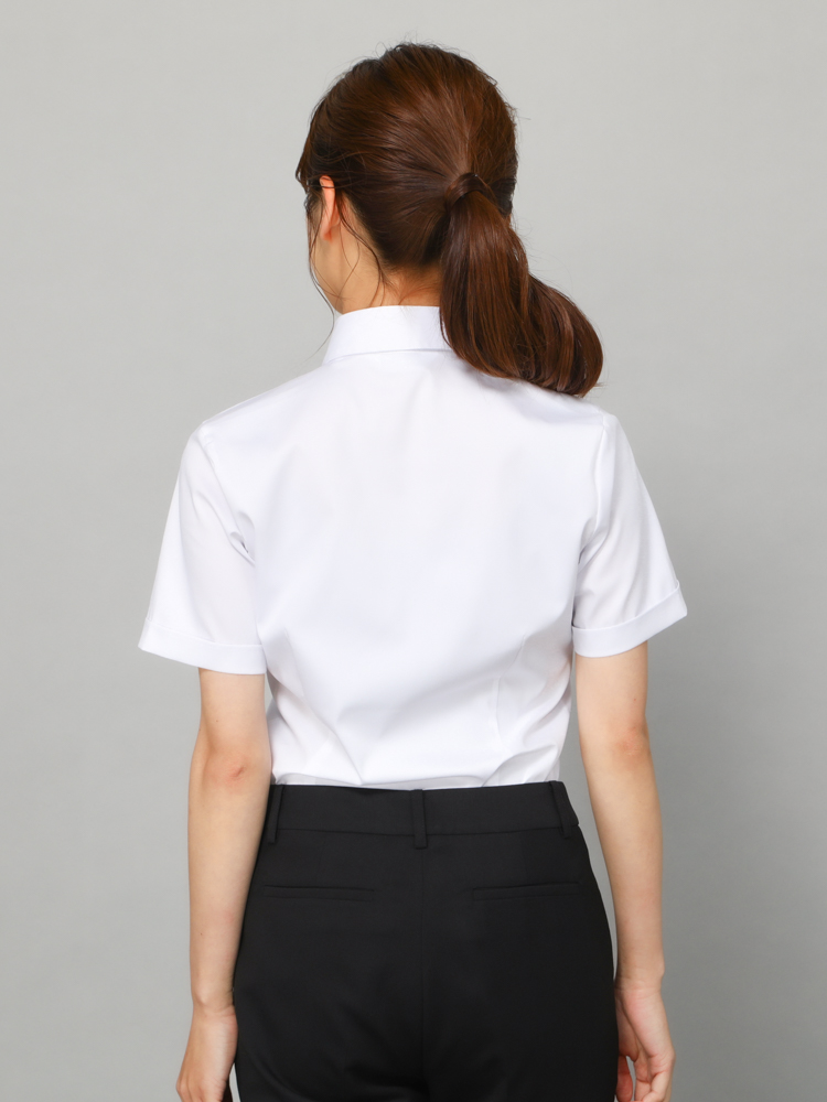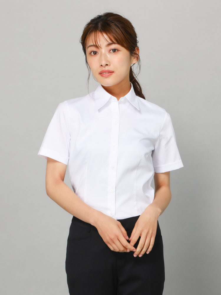清潔感があり、透けにくいホワイトカラーの半袖レギュラーブラウス。