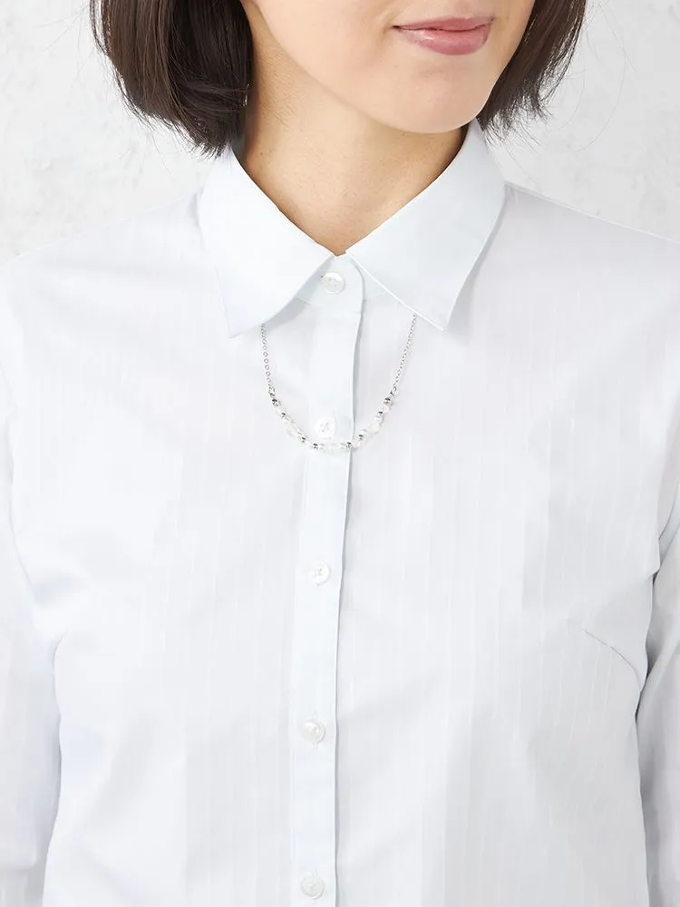 取り外し可能なビジュー付きで気分によって2通りの着こなしが楽しめるレギュラーブラウス。爽やかなストライプ柄。