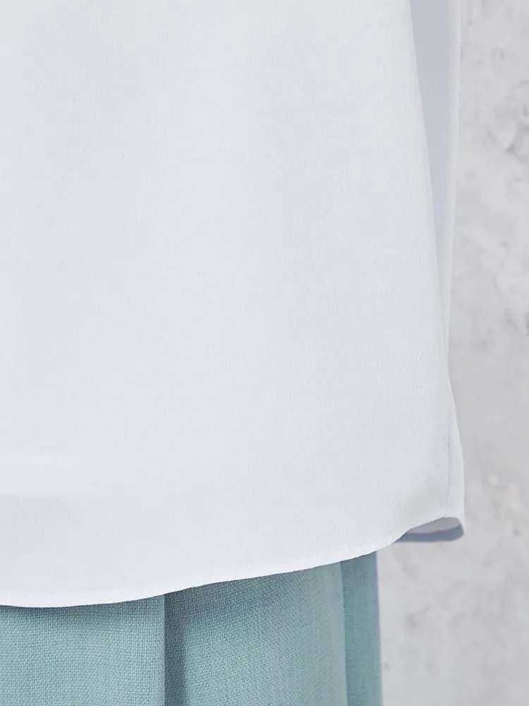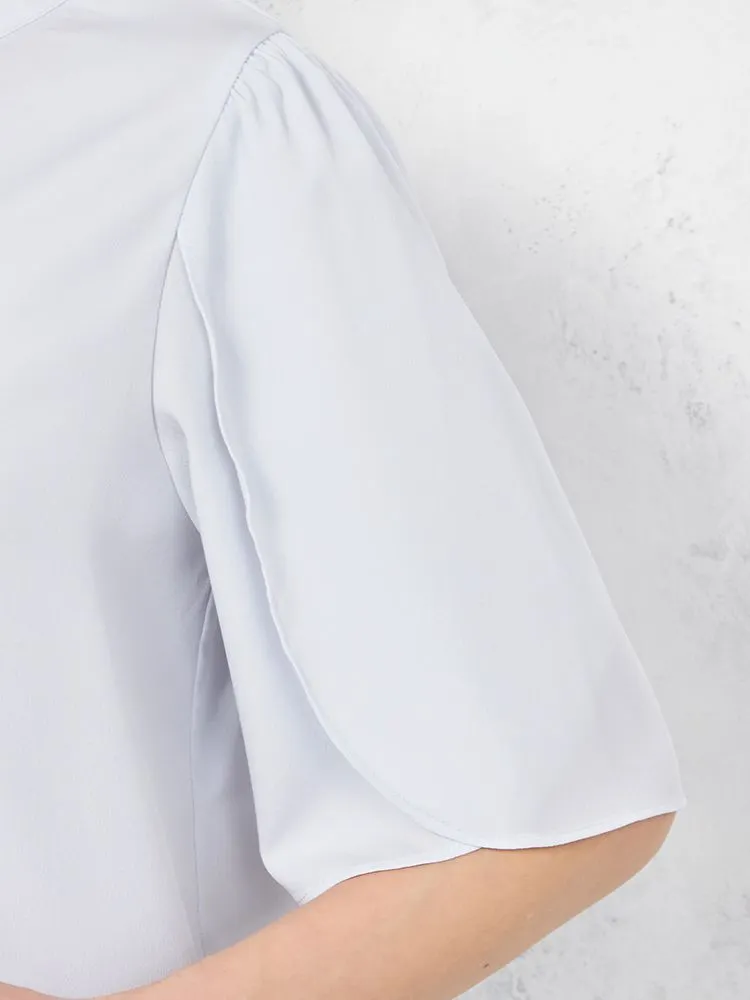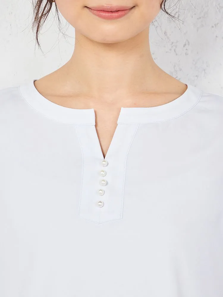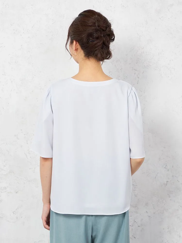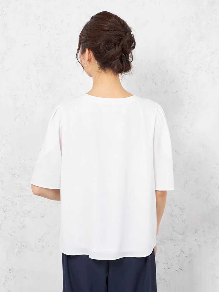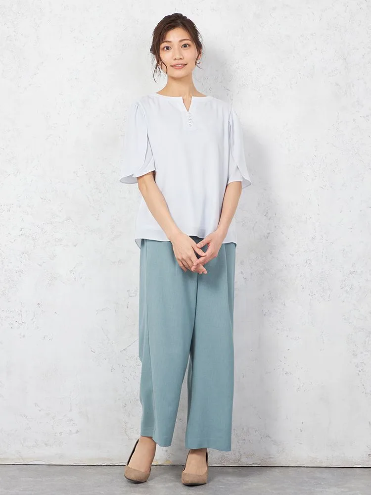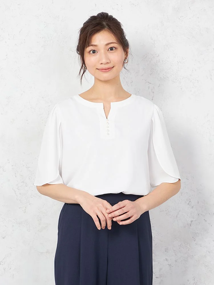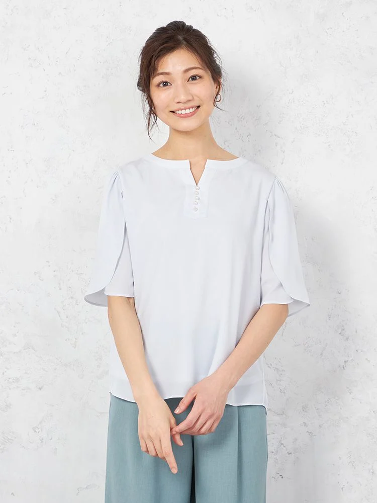 花びらのようなスリットスリーブと、フロントのパールボタンがフェミニンな5分袖ブラウス。