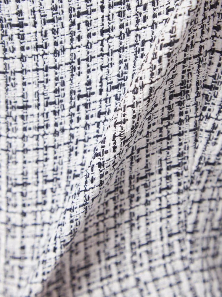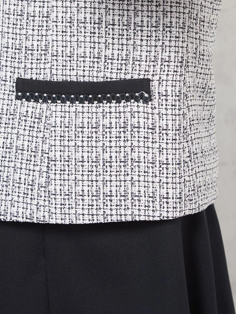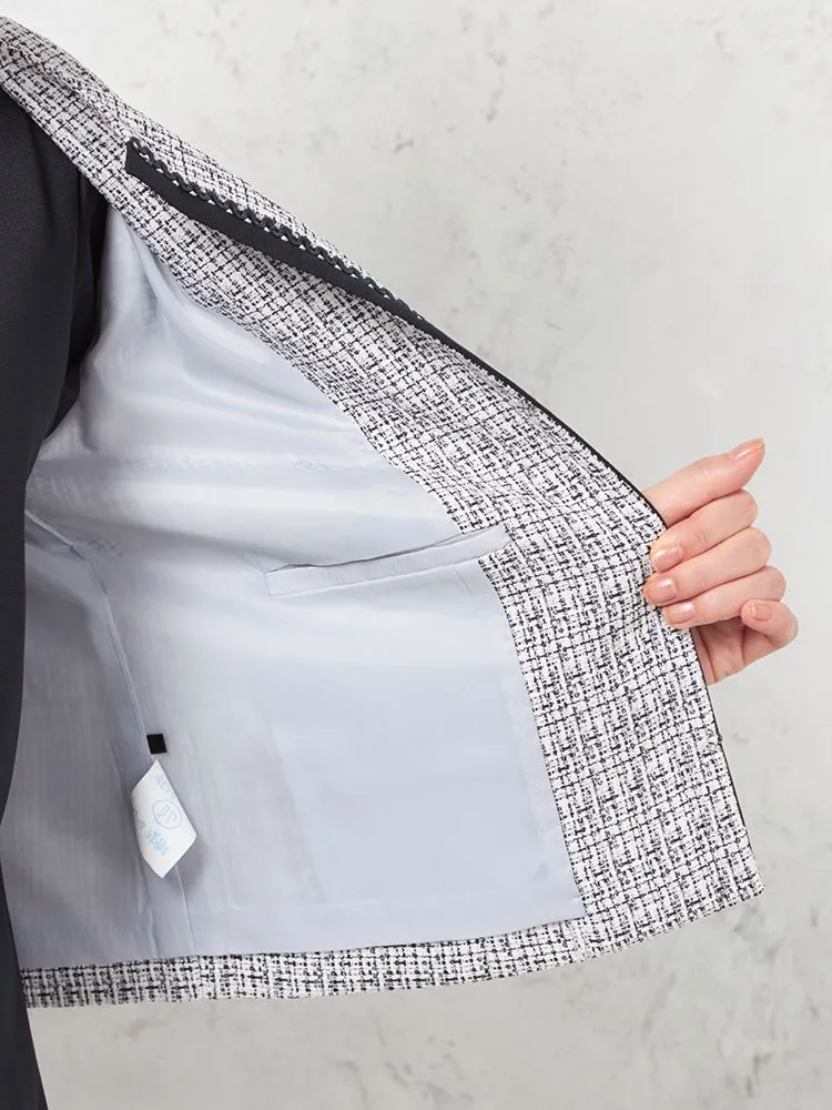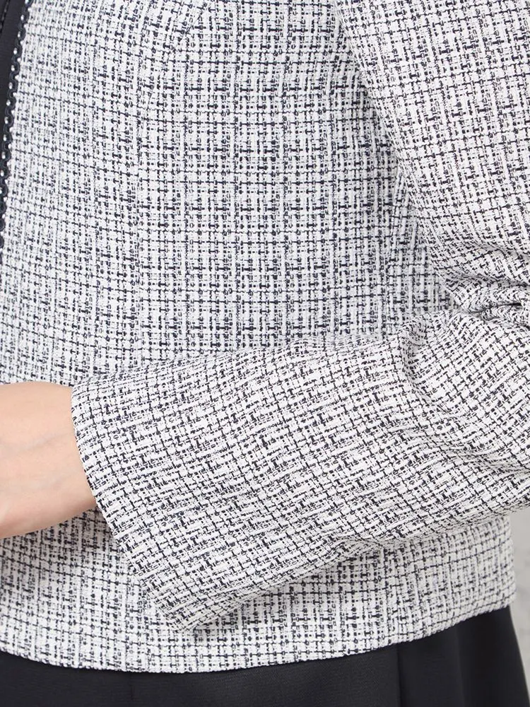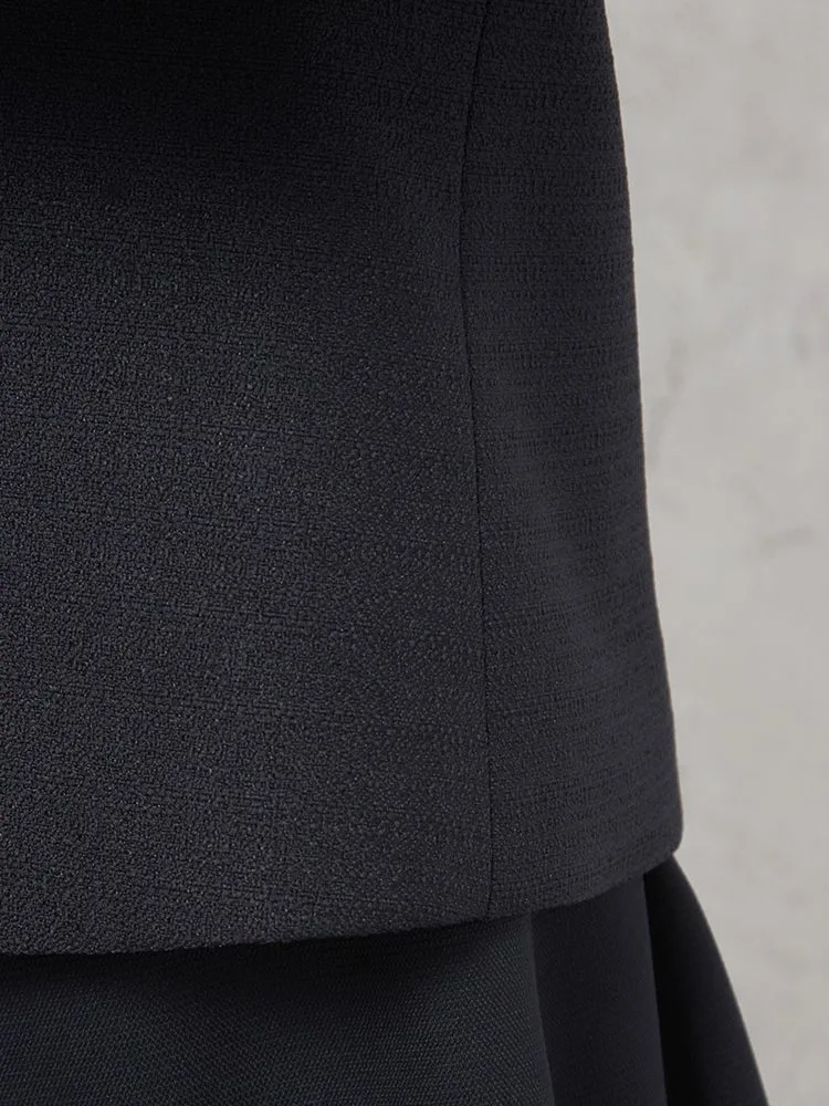 入園入学には白黒のツイードジャケットを、卒園卒業にはネイビー無地のジャケットを着用すればコーデが完成。