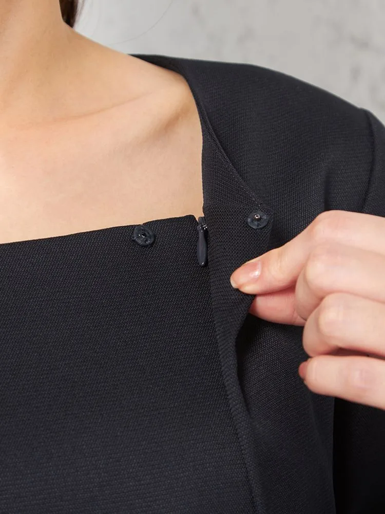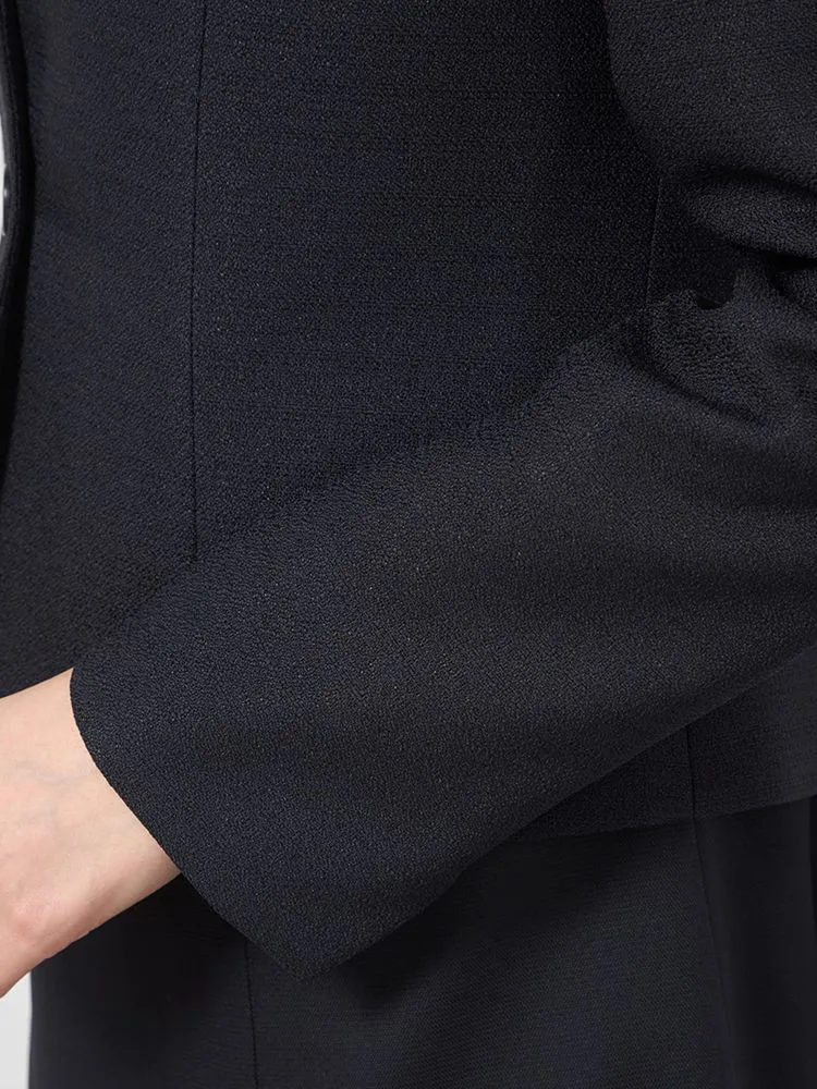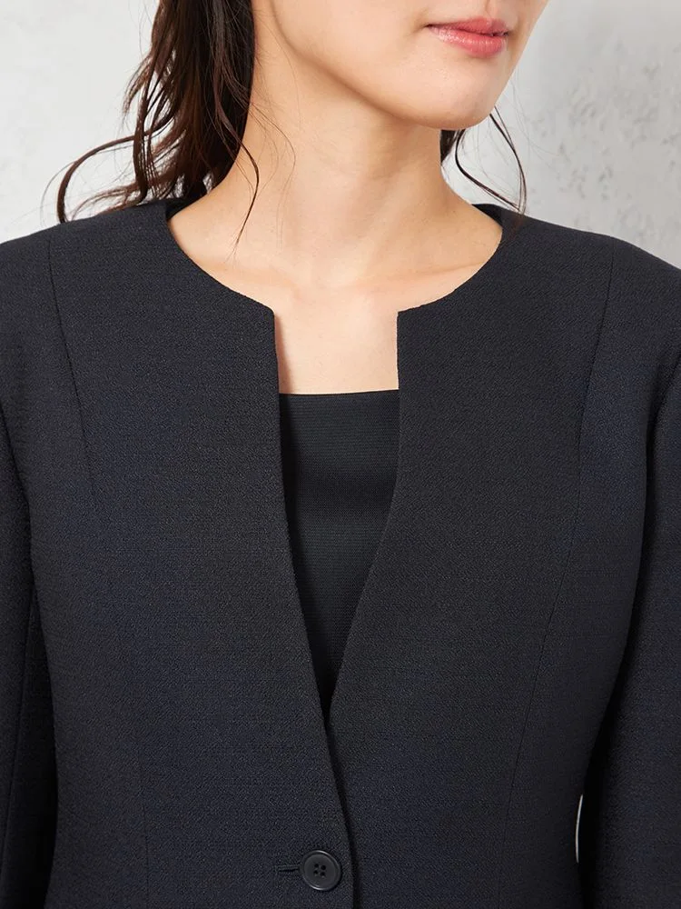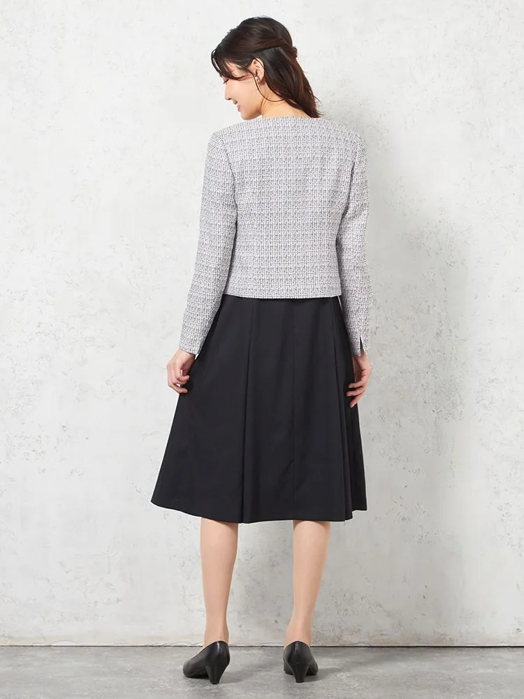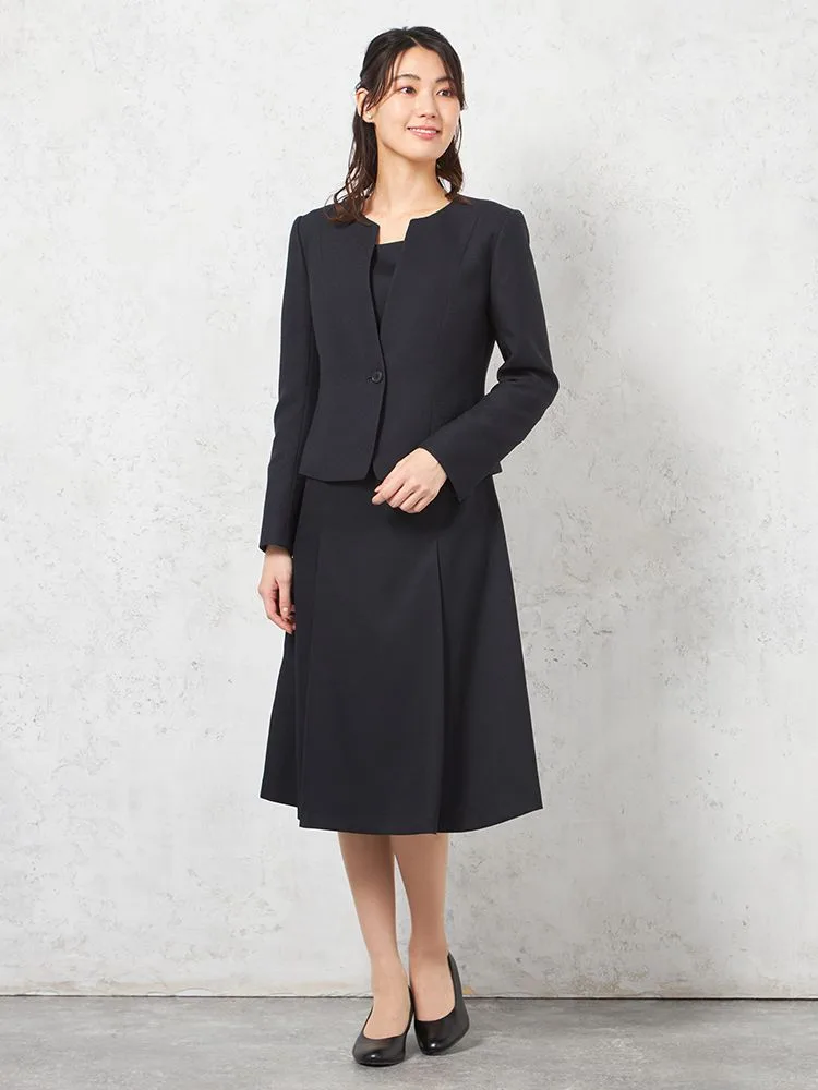 ラウンドネックノーカラージャケット と V 開きノーカラージャケット・ワンピースの 3 点セット。