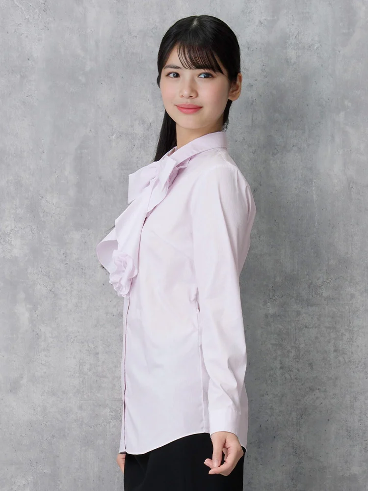 【4WAYフリル&リボン付】長袖 ブラウス スキッパー 形態安定 透けにくい 織柄無地 ViVi 通年【レディース】(L.ピンク)