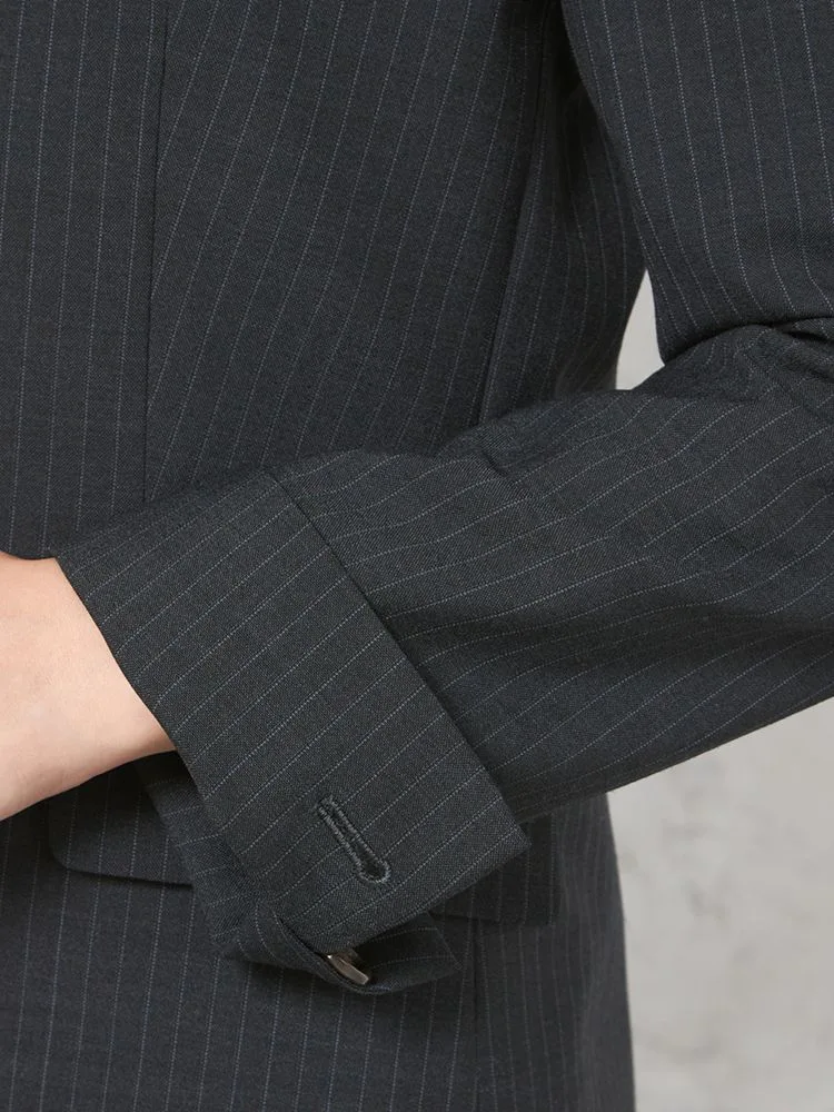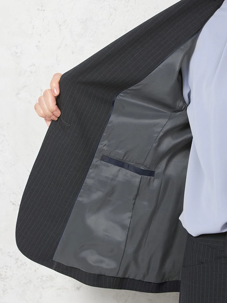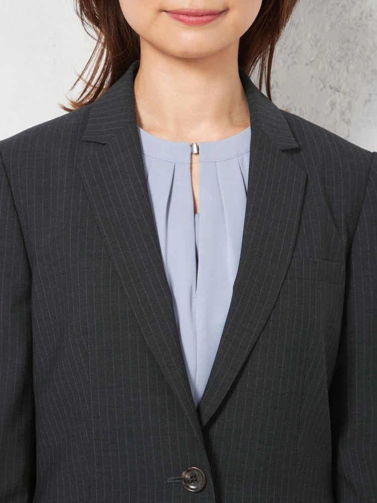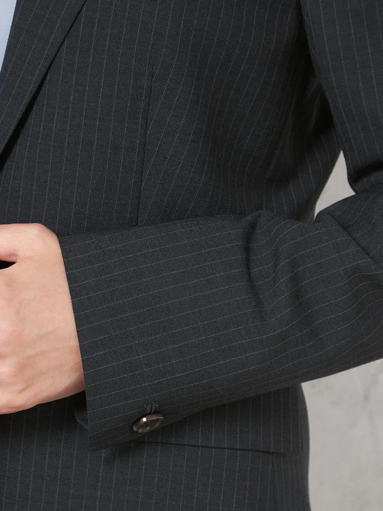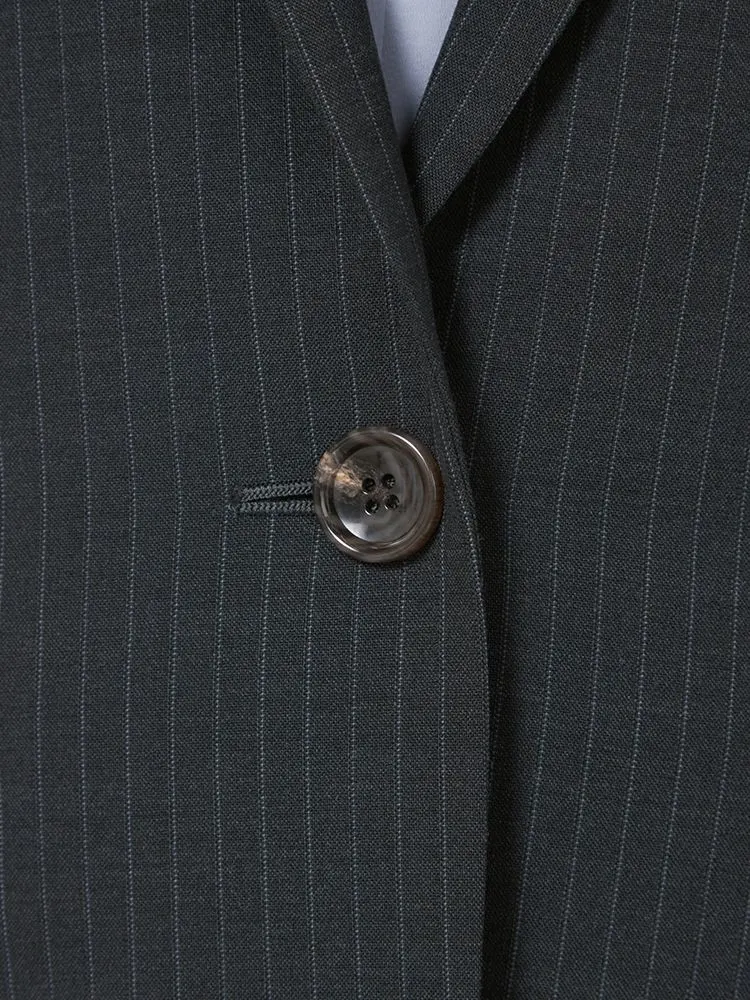 スタンダードなピンストライプ柄のシングルジャケット。フロントと袖口は軽やかな1つボタン仕様で、左右にはフラップポケットを備えています。