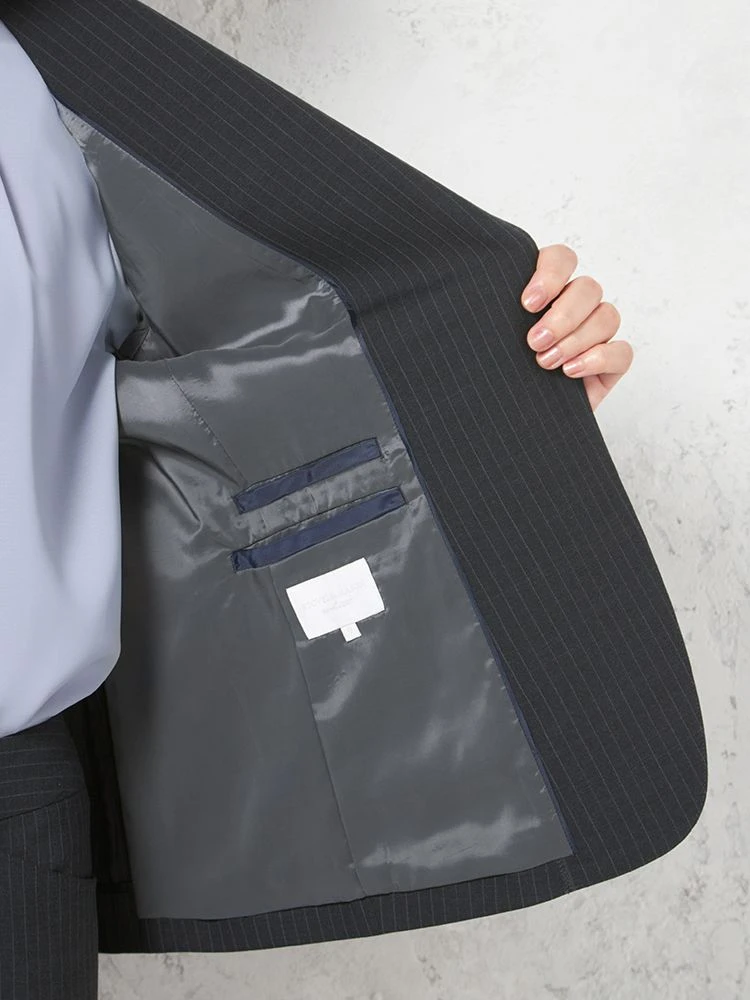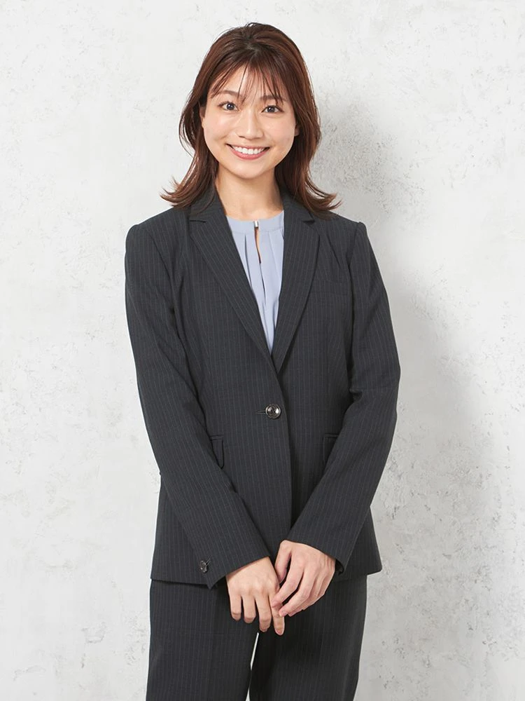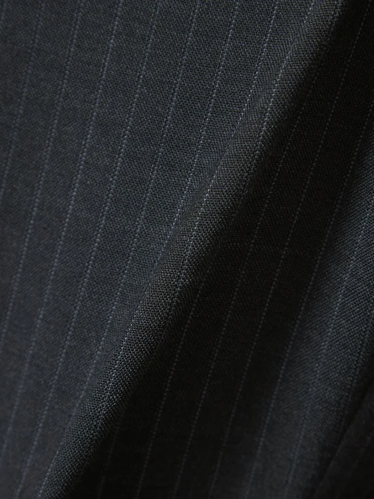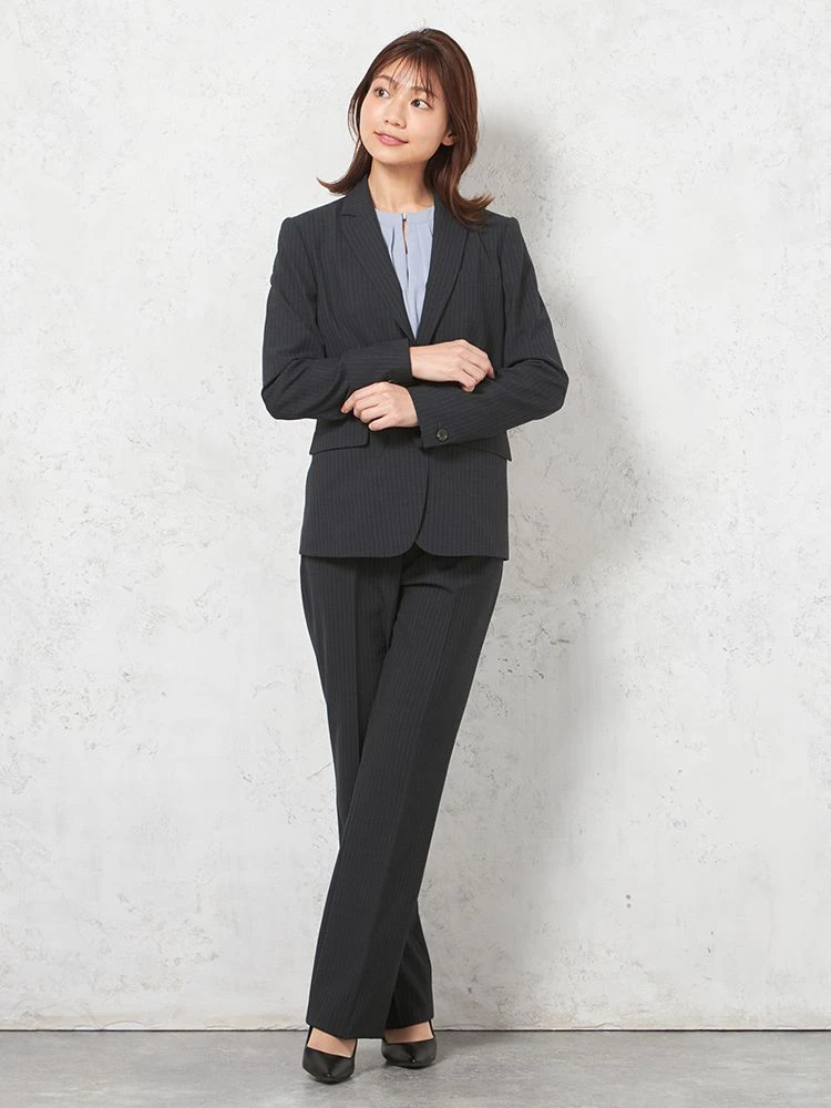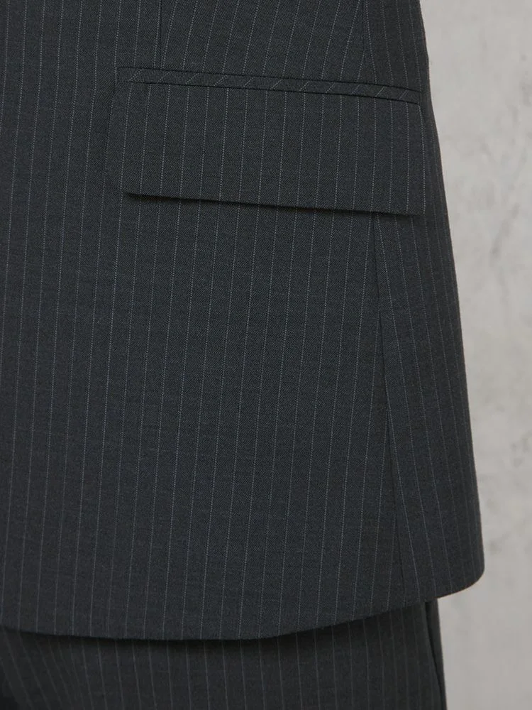 スタンダードなピンストライプ柄のシングルジャケット。フロントと袖口は軽やかな1つボタン仕様で、左右にはフラップポケットを備えています。
