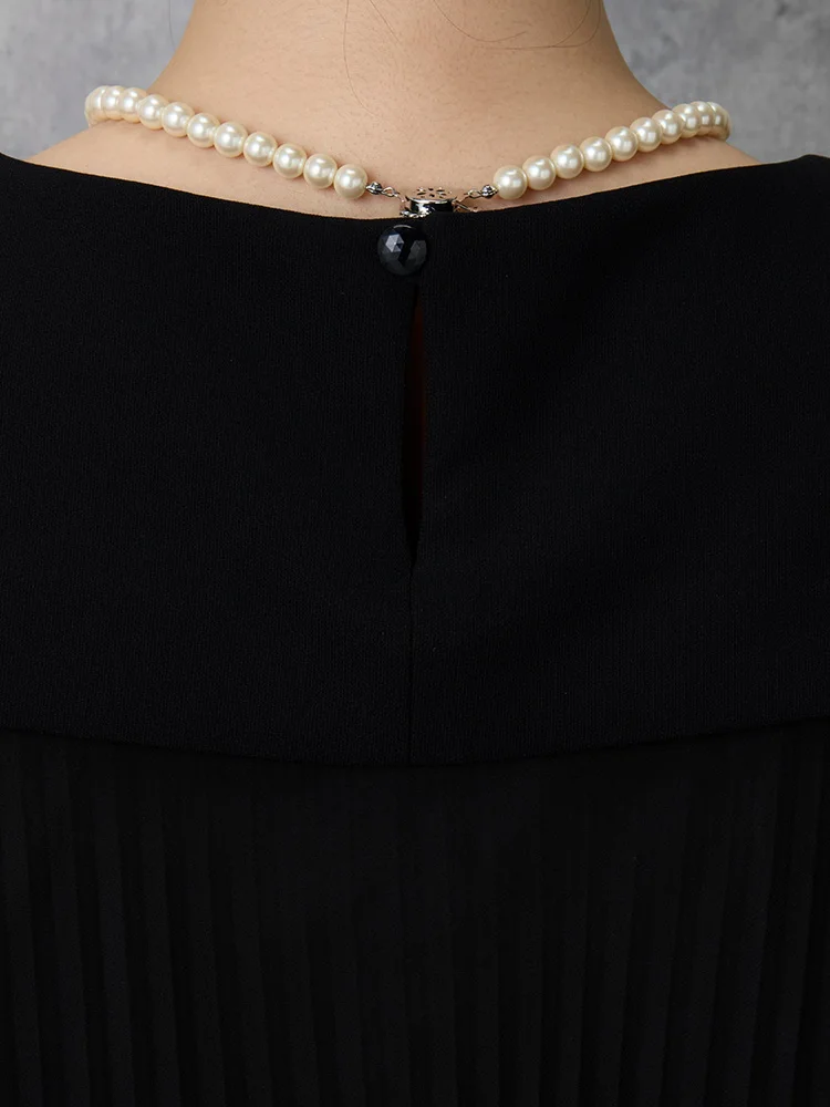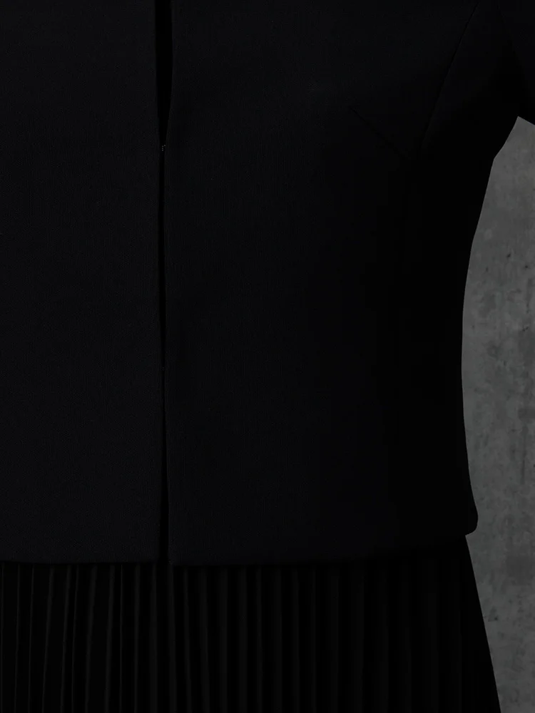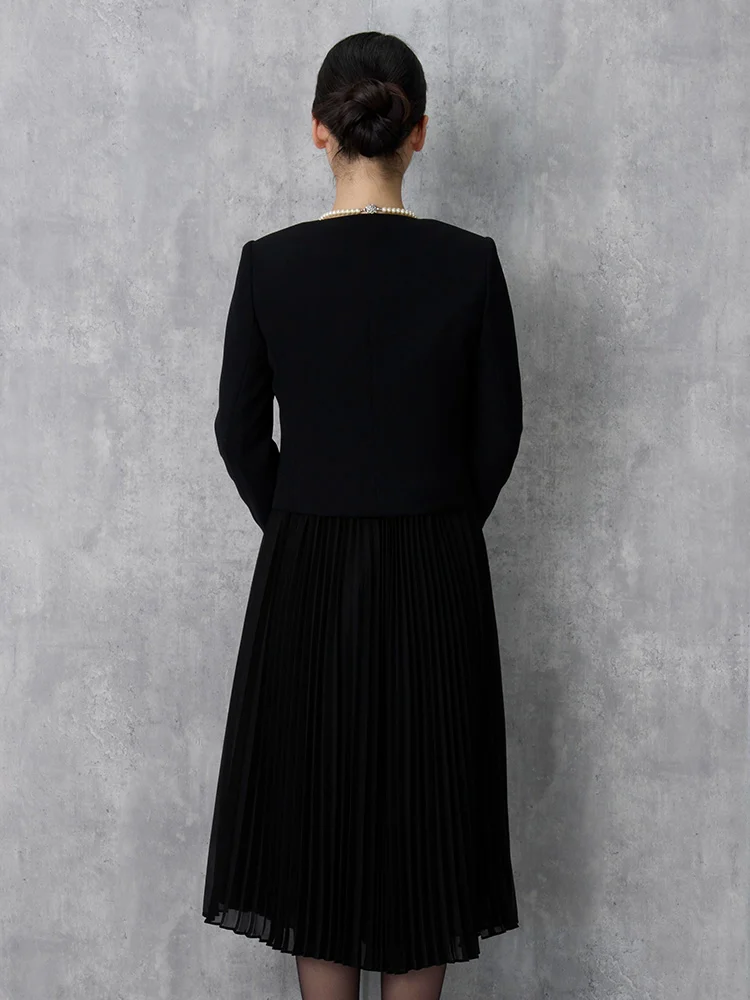 プリーツ仕立てのワンピースと、ノーカラージャケット、ネックレスが付いた3点セットフォーマル。