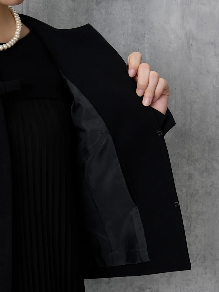 シンプルなノーカラーのジャケットは、リボンの取り外しができ、用途に合わせ2WAYでご着用いただけます。