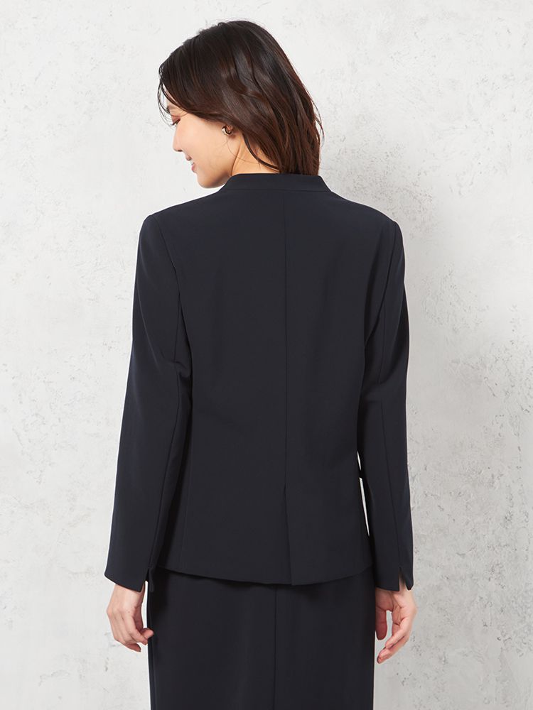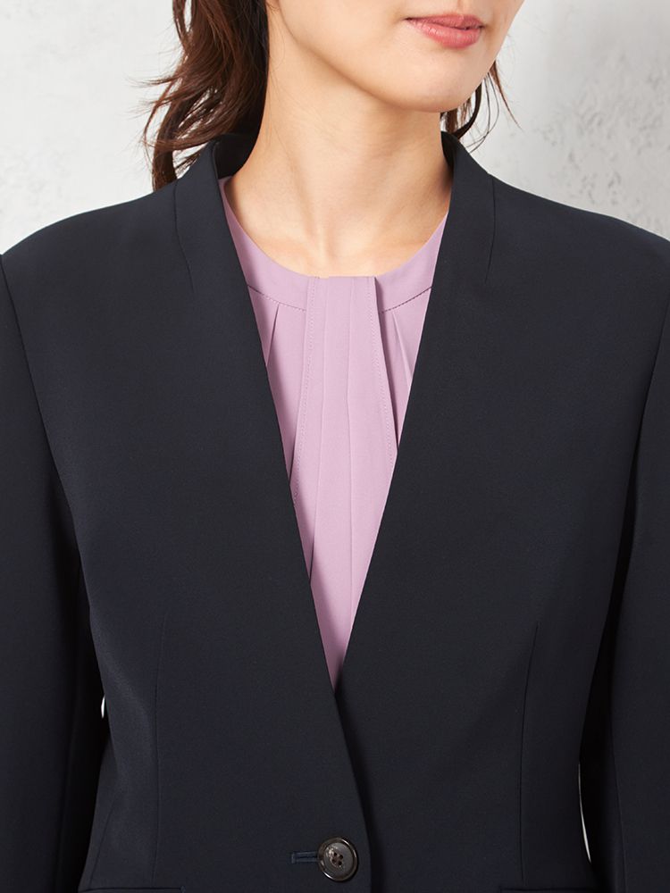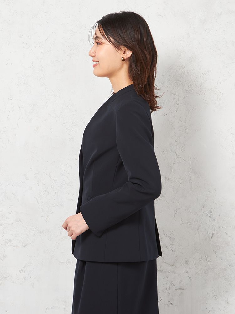 シンプルなノーカラージャケットは、立体的なフォルムを構築できるよう少し張りのある素材を採用。