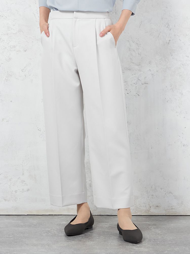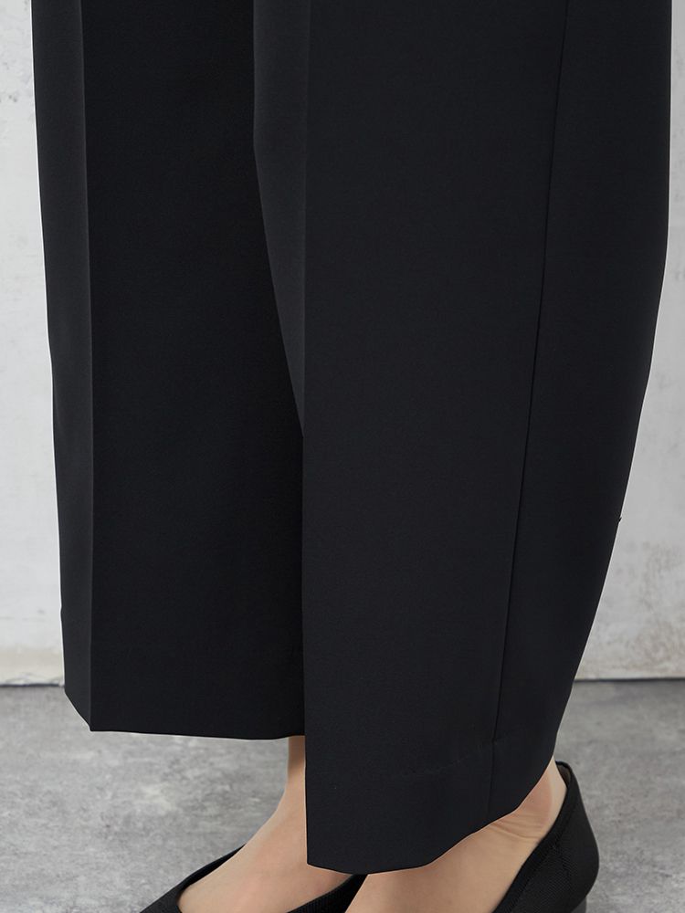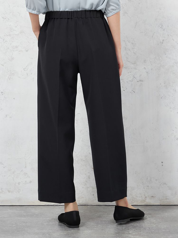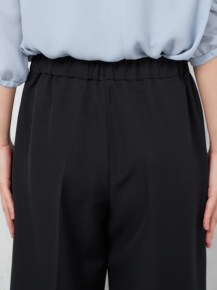 腰まわりのタックやゴム仕様のバックウエストで仕上げた、ゆとりのある着用感もポイント。