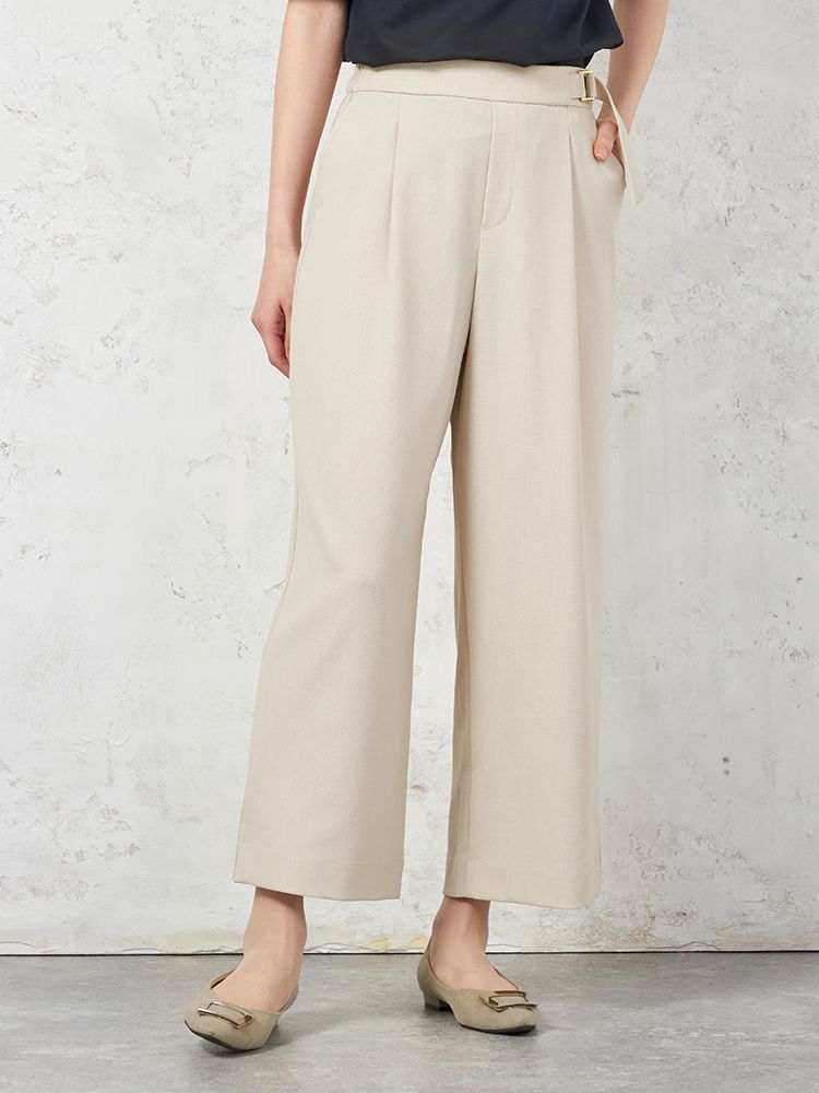 【ウォッシャブル】WALK PLUS サイドタブ ワイドパンツ 麻調メッシュ素材 無地 春夏【レディース】(ベージュ)