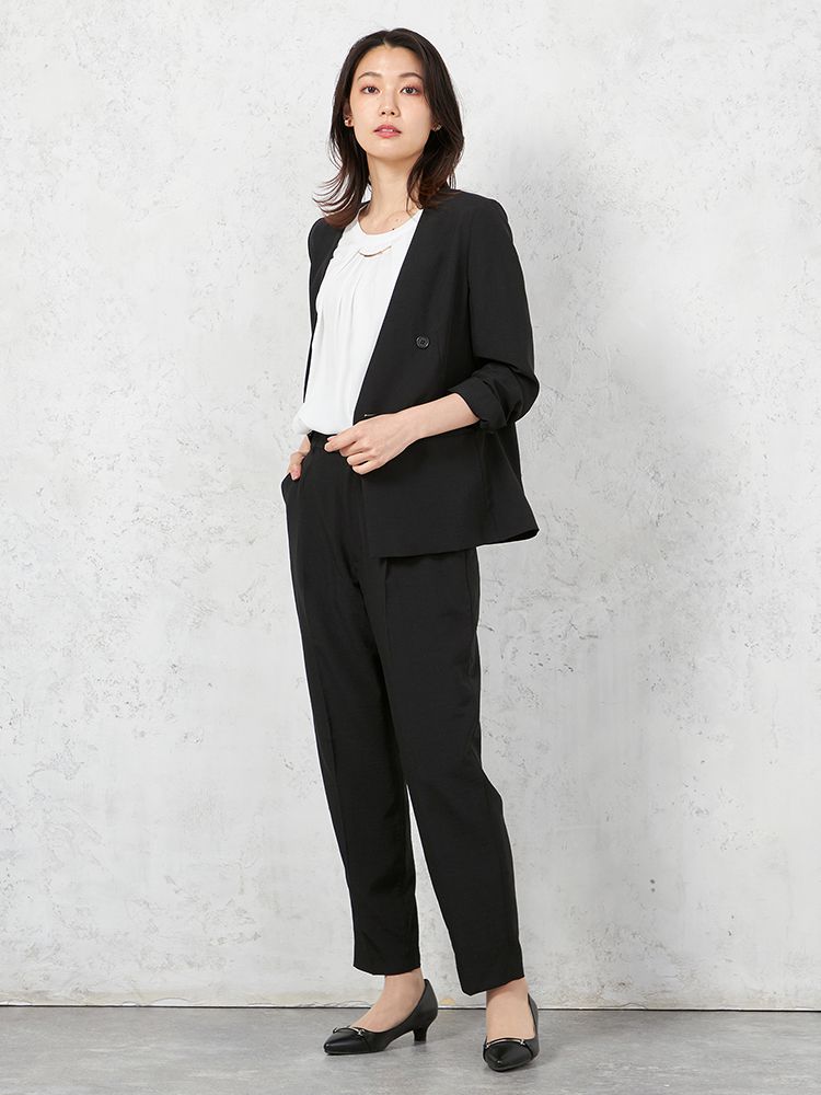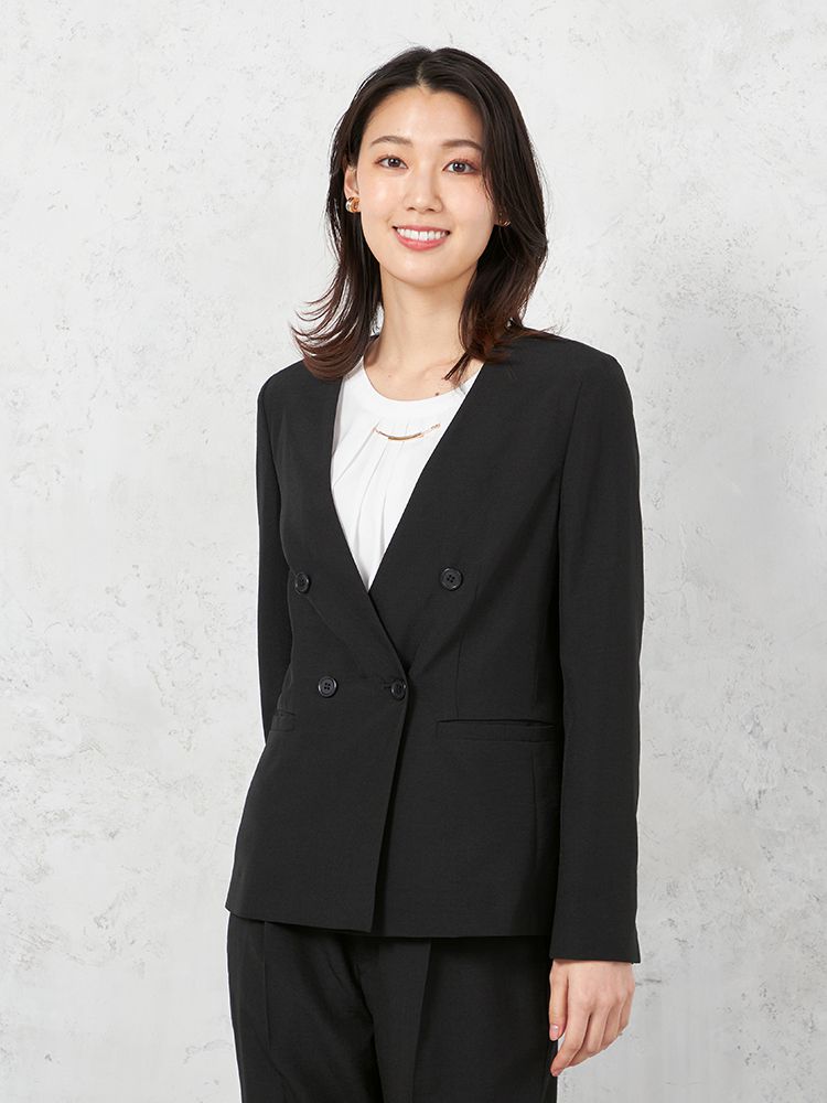 夏らしい軽やかなリネンライク素材を使用したノーカラーダブルボタンジャケットです。