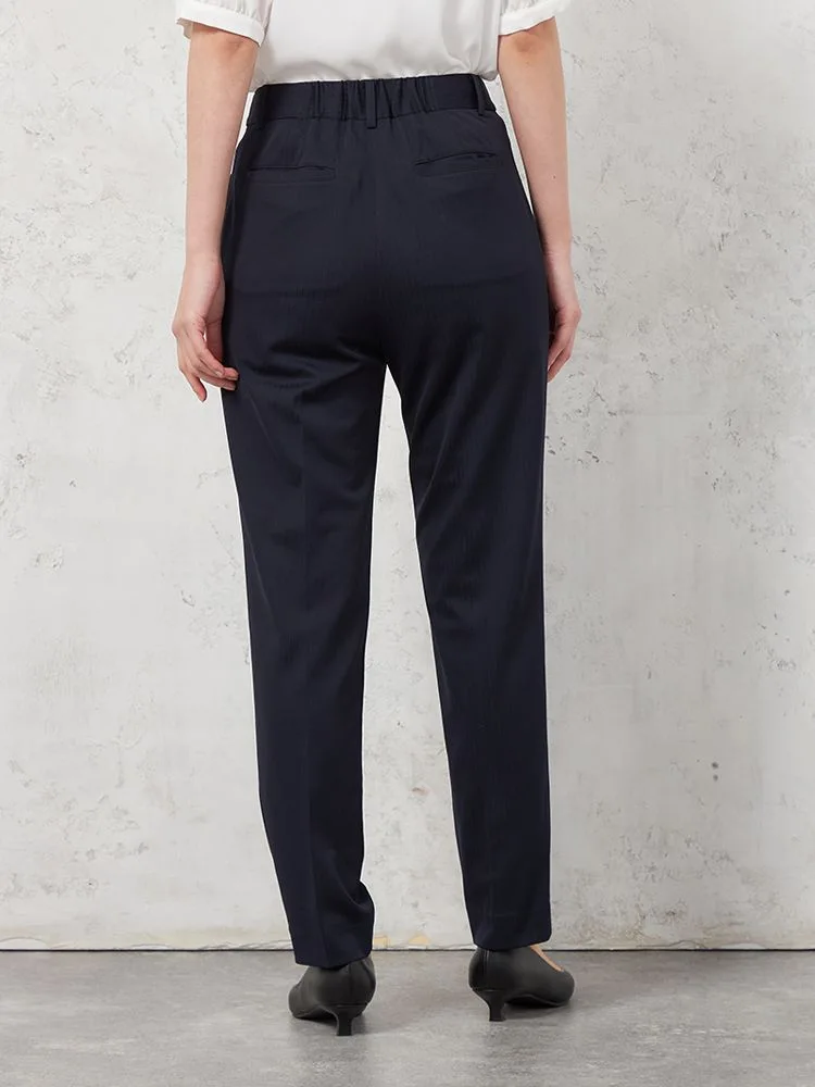 パンツの腰回りに生地の折り込みがなく、スッキリとしたシルエットを実現します。シンプルで洗練された印象を与え、すっきりとした着こなしが可能です。