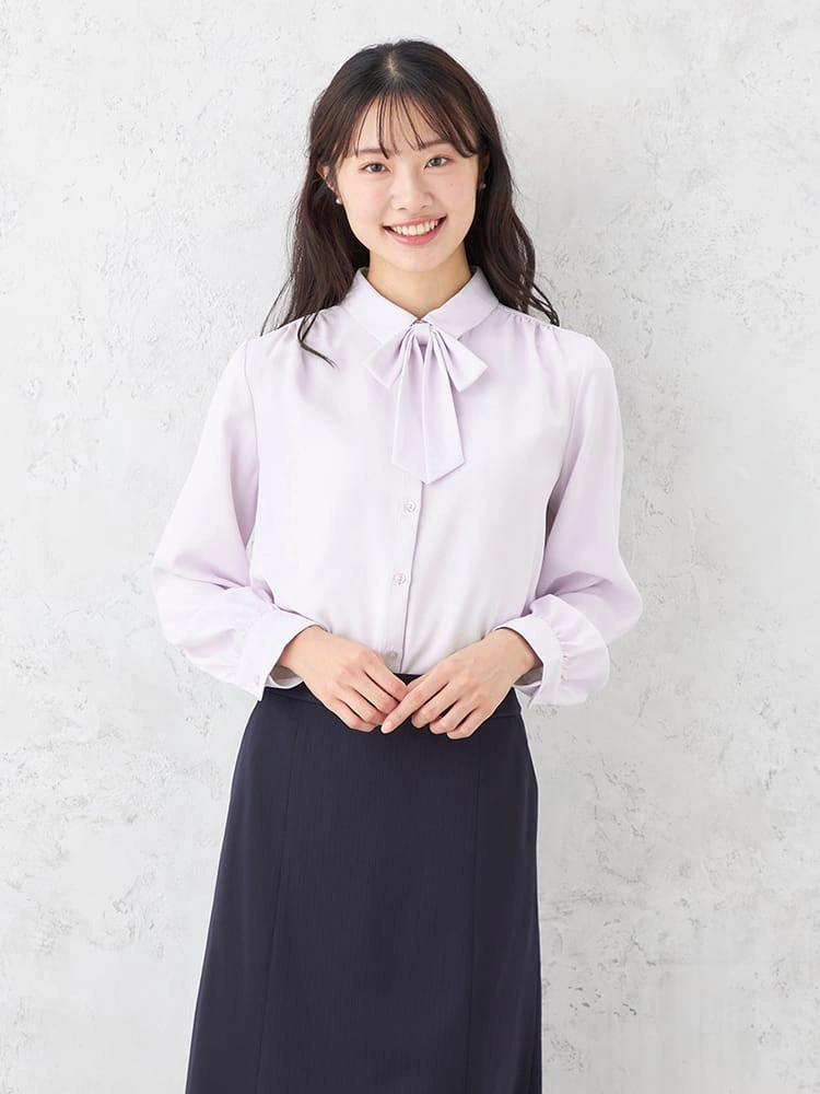 【2WAYリボン付】長袖 ブラウス レギュラーカラー ストレッチ 透けにくい 無地 ViVi 通年【レディース】(ラベンダー)