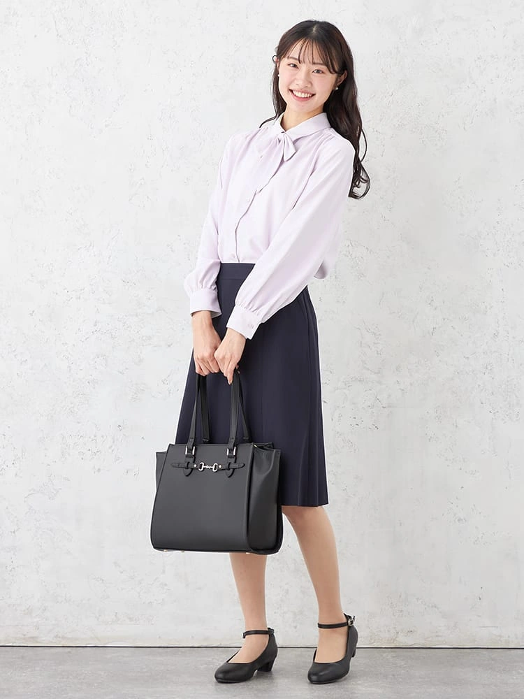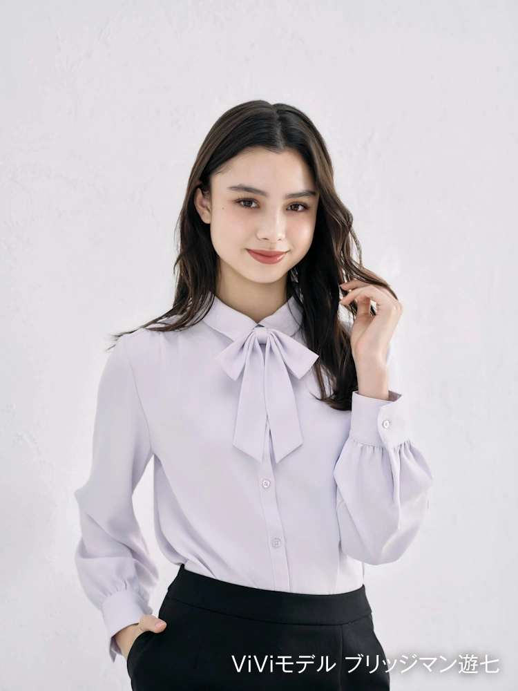 取り外し可能なリボン付きで、気分やコーディネイトによって2通りの着こなしが楽しめるレギュラーブラウス。