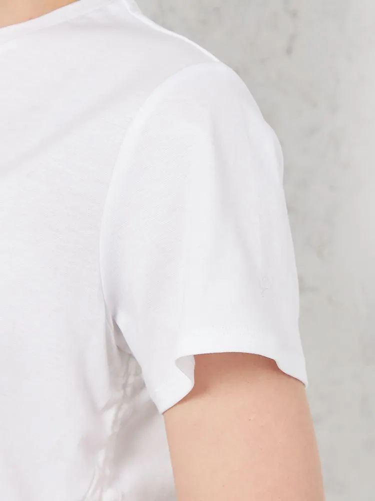 適度な肉感のポンチ素材で身体のラインを拾いにくく、またシルケット加工を施すことにより、滑らかな肌触りと上品な表面感に仕上がっています。