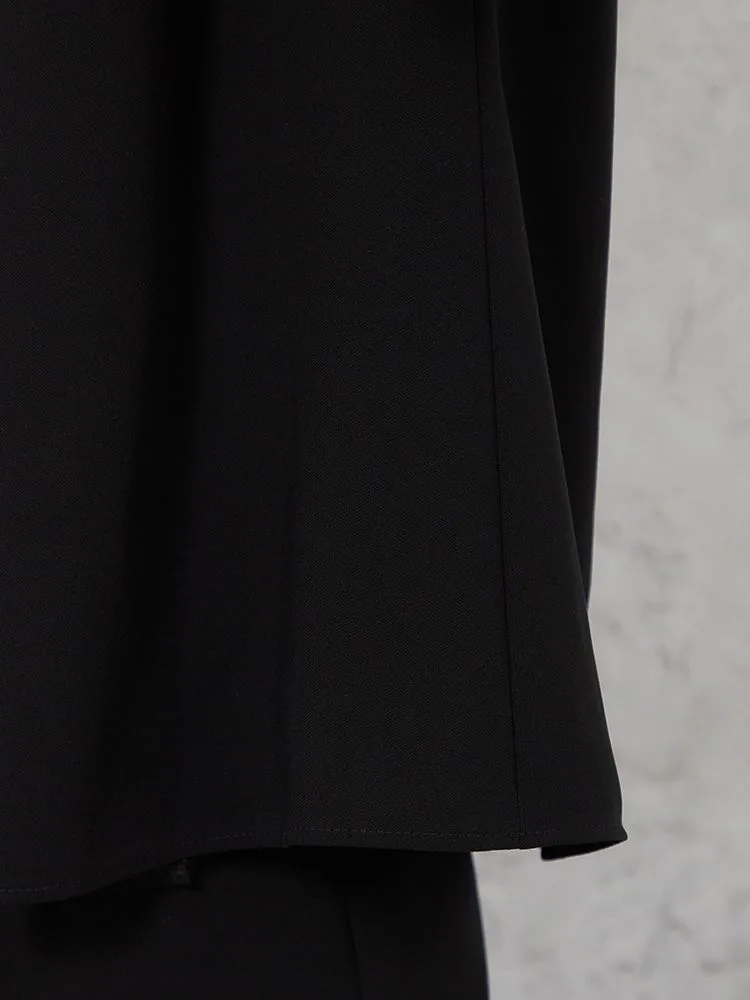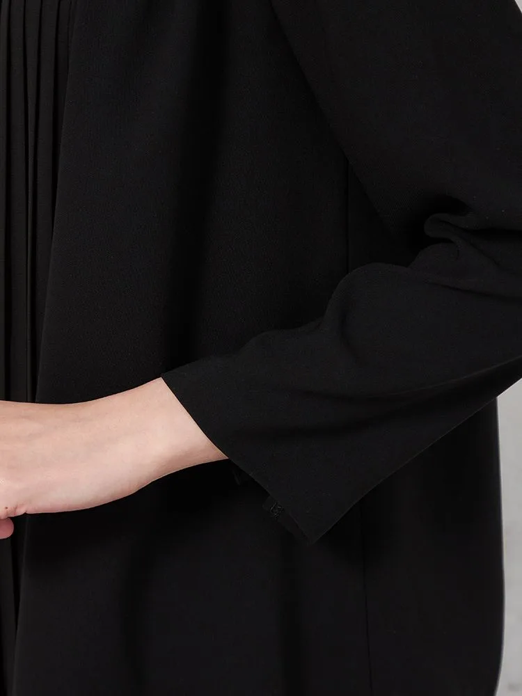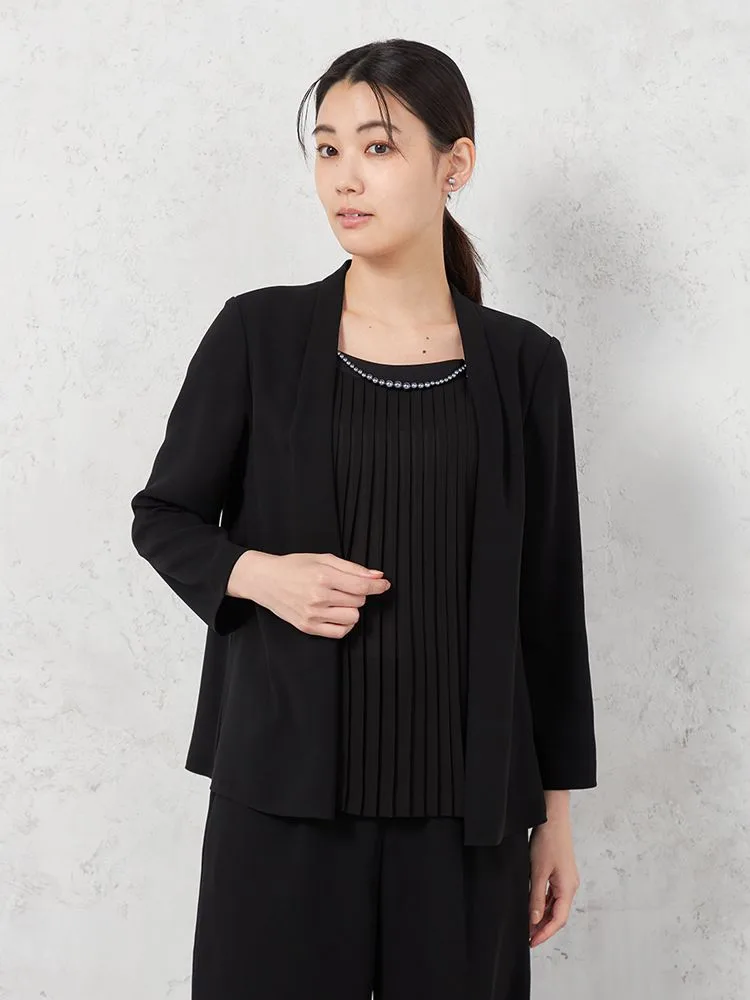 前身頃はジャケットを羽織ったように見える重ね着風仕様で内側のプリーツが縦ラインを強調し、着痩せ効果があります。