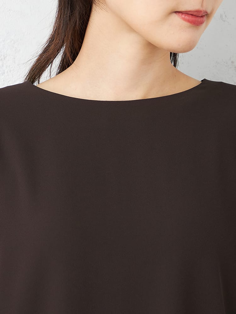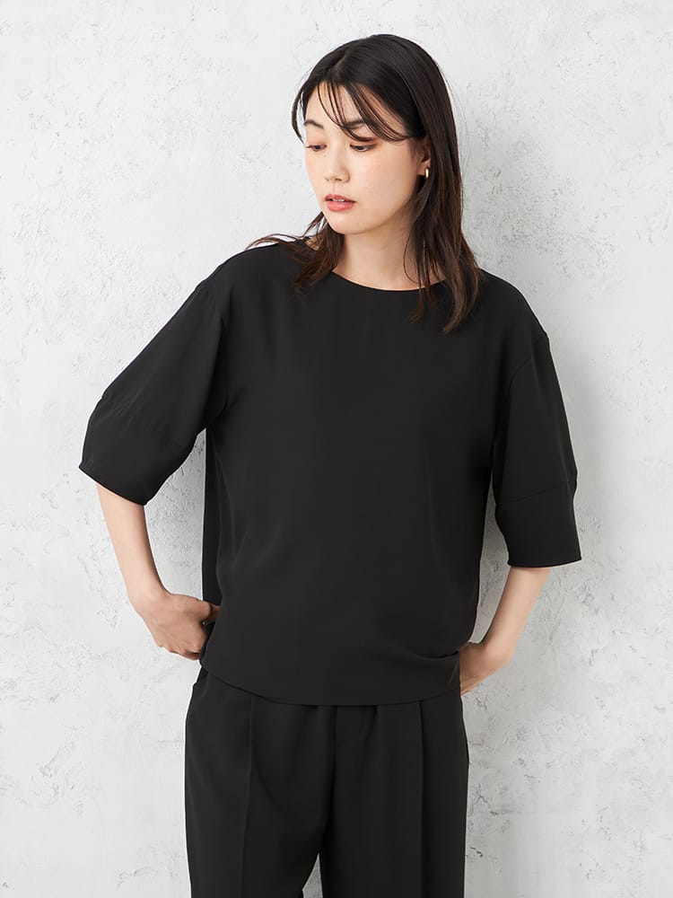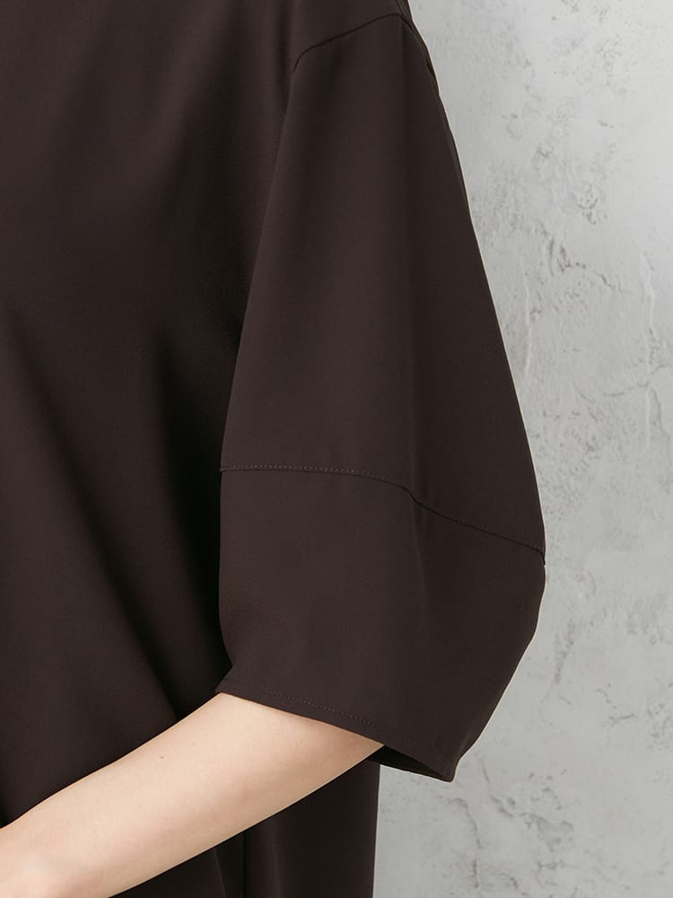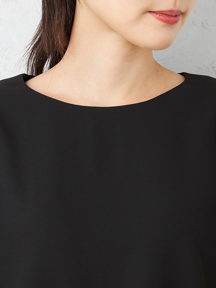 ゆとりのあるランタンスリーブブラウスでとても楽な着心地ですが、艶感のある素材と切替のあるデザインで、きちんと感も演出できます。