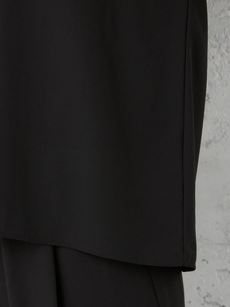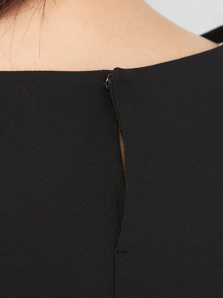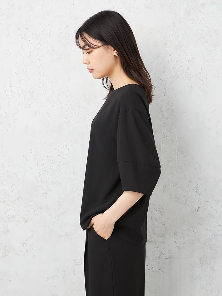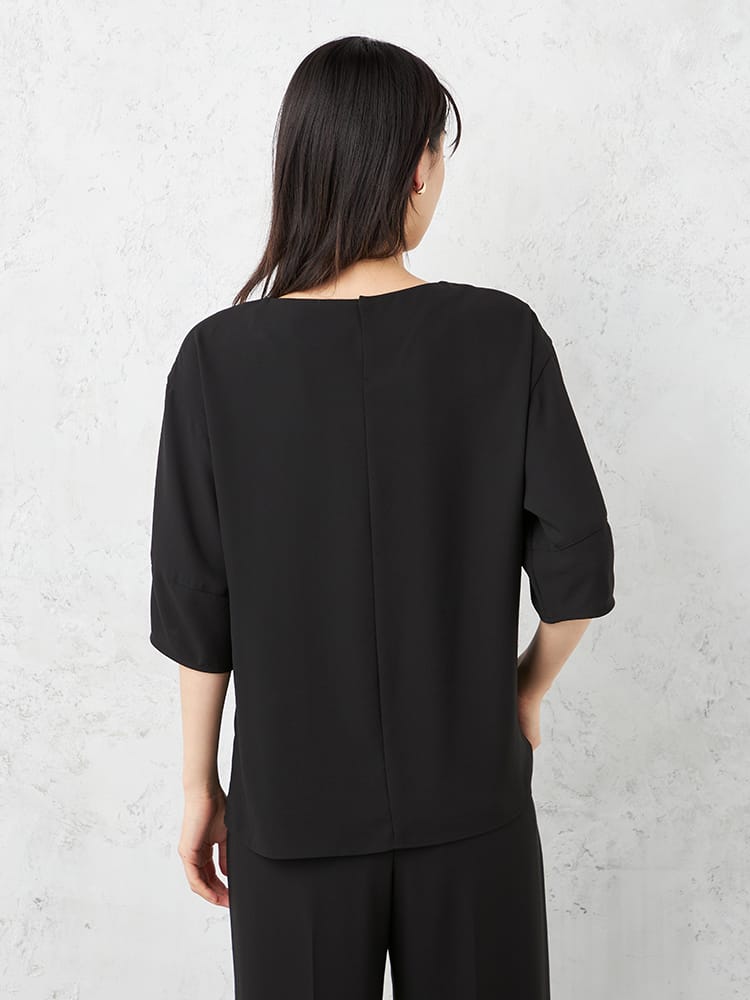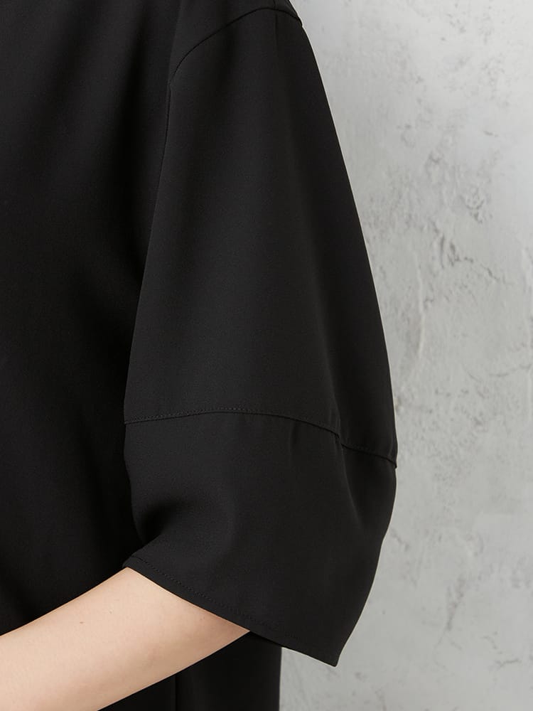 ゆとりのあるランタンスリーブブラウスでとても楽な着心地ですが、艶感のある素材と切替のあるデザインで、きちんと感も演出できます。