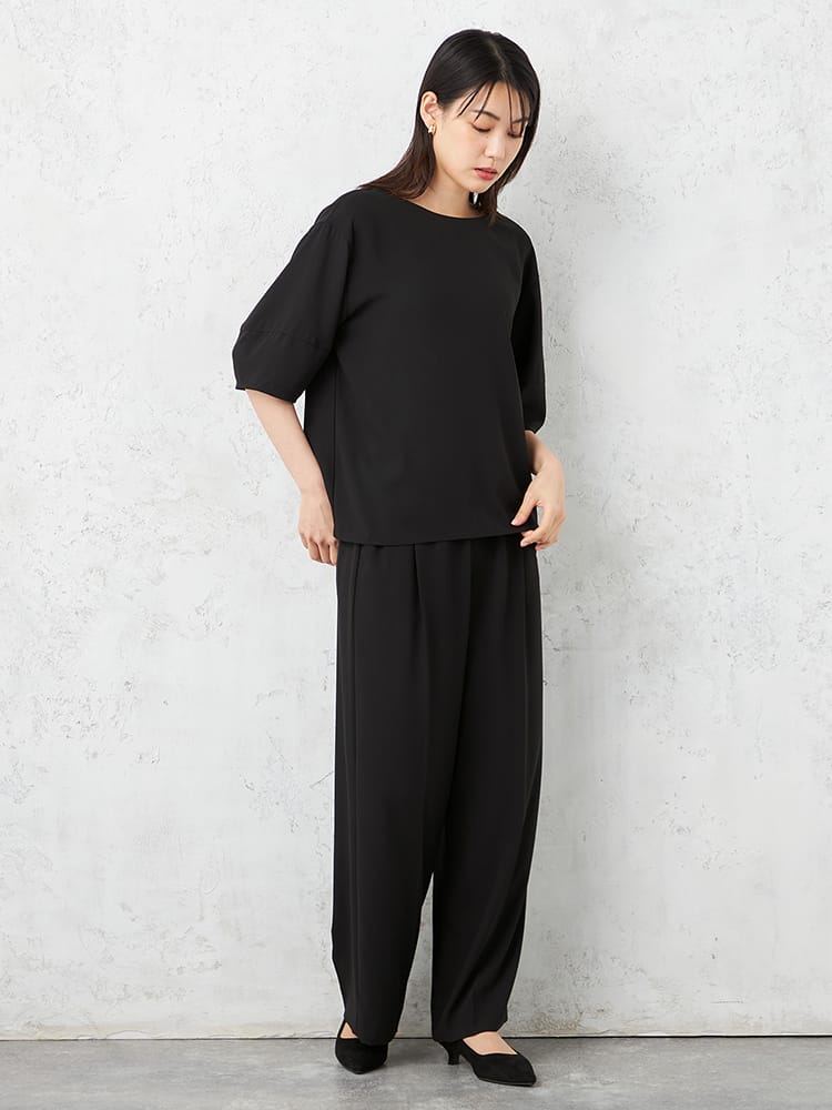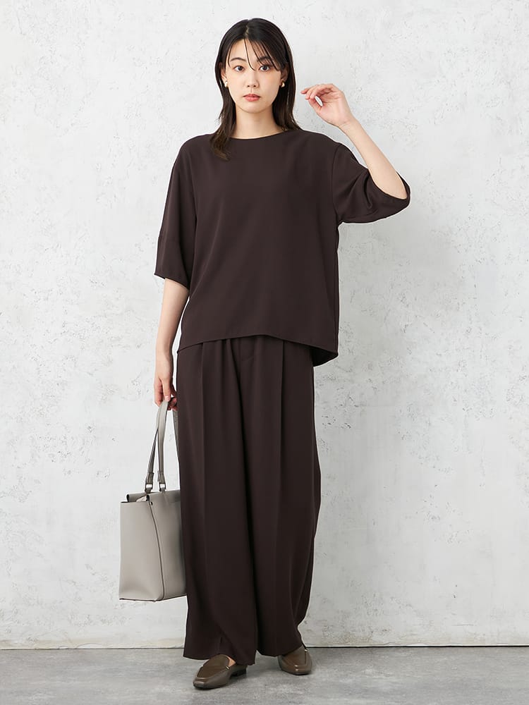 ブラウスとパンツのセットアップで楽しめてコーディネートもラクチンです。