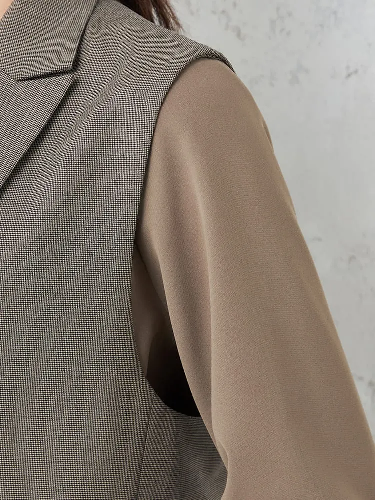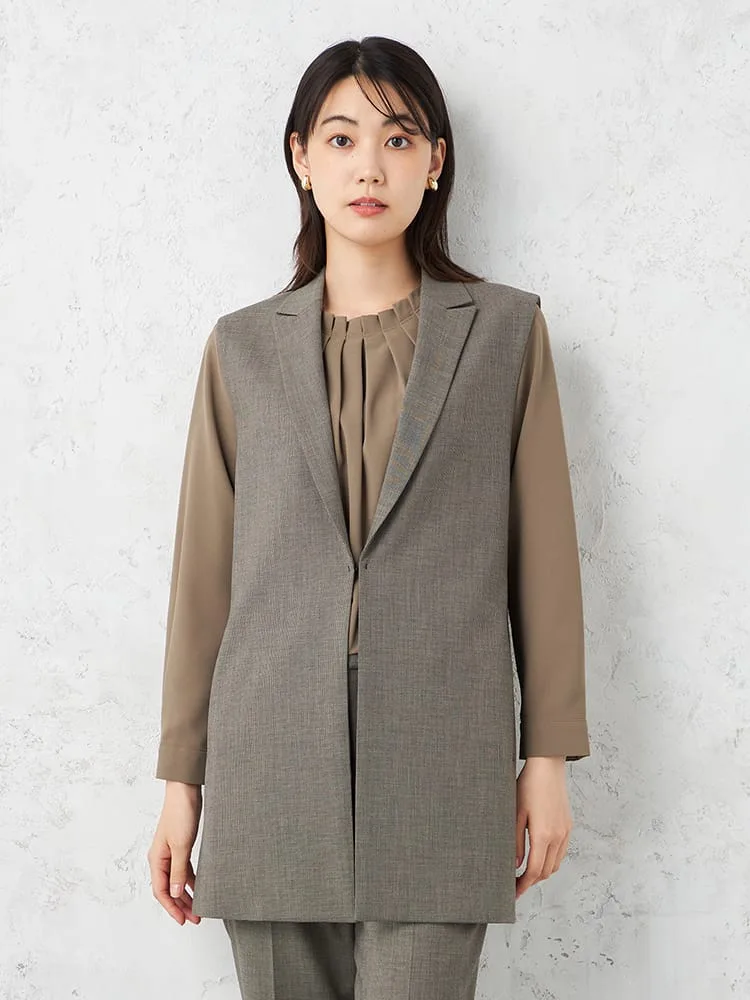 衿付きのテーラードタイプできちんと感をキープしたベスト。釦をつけずシンプルに仕上げました。
