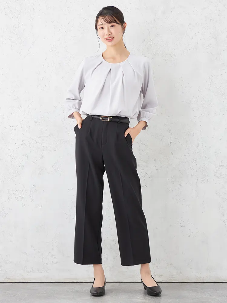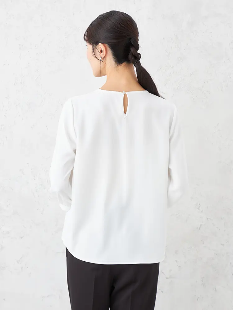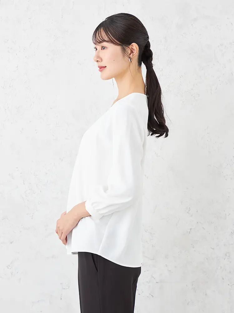 左右非対称のフロントタックが印象的な、7分袖のプルオーバーブラウスです。