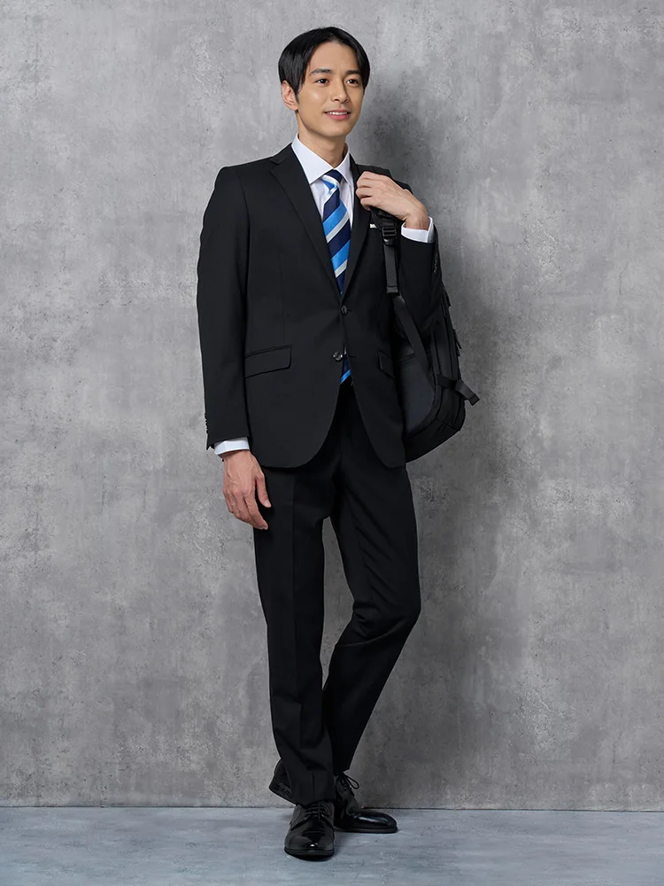 【即納】スリーピーススーツ2つボタン【WEB限定】上下ウォッシャブルブラックシャドウストライプ3シーズン対応