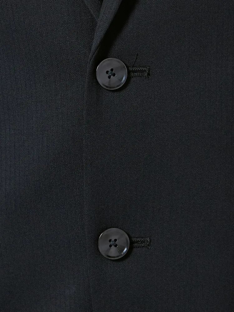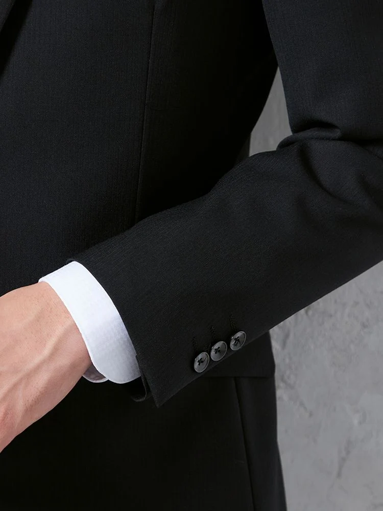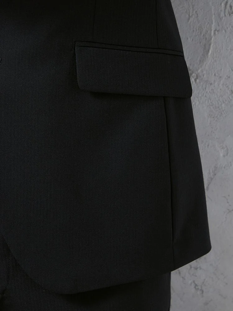 細かなストライプ織り、ハイゴージのナローラペルが、スリムなシルエットをよりシャープに見せます。