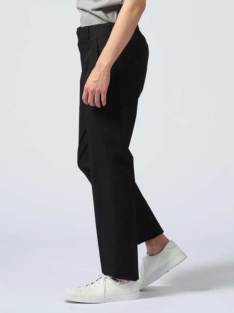 パンツの腰回りに生地の折り込みがなく、スッキリとしたシルエットを実現します。シンプルで洗練された印象を与え、すっきりとした着こなしが可能です。