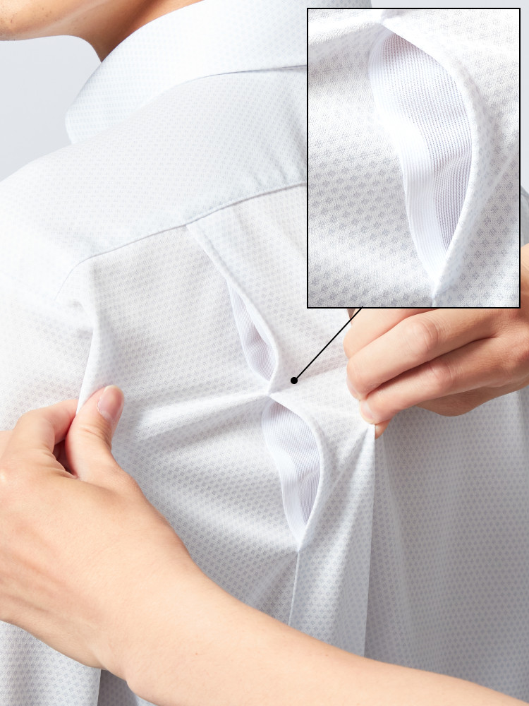 冷感加工に加え背中部分のベンチレーション・ヨーク部分メッシュ仕様により、衣服内の通気性が良く不快なべとつき感を軽減してくれます。
