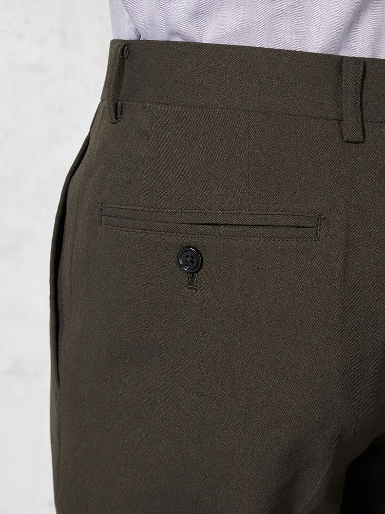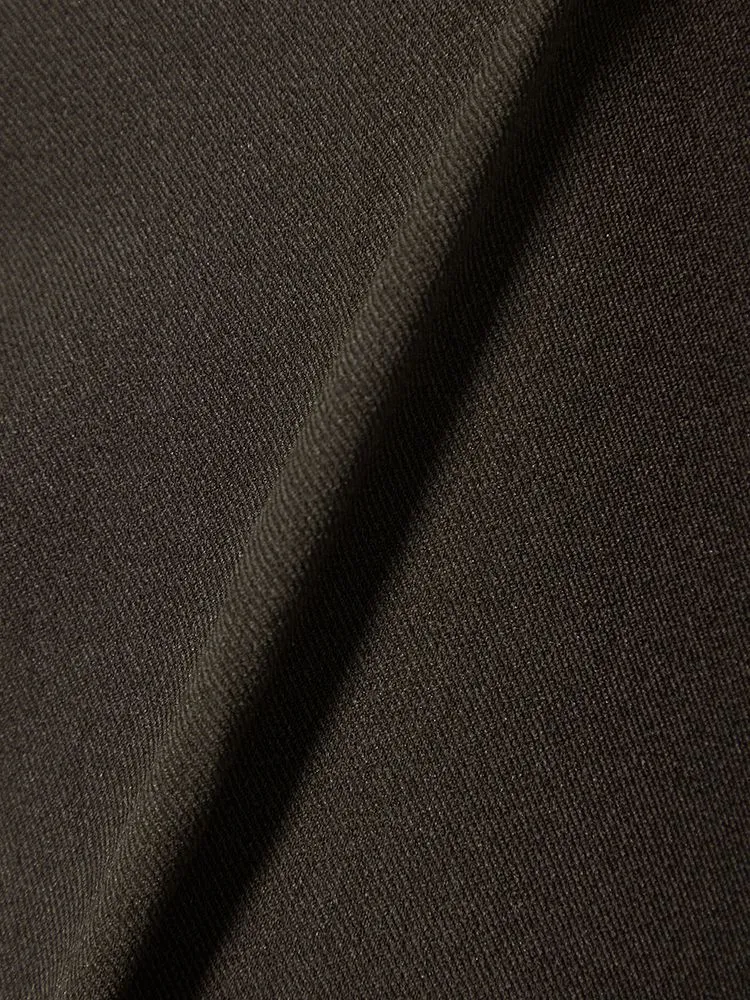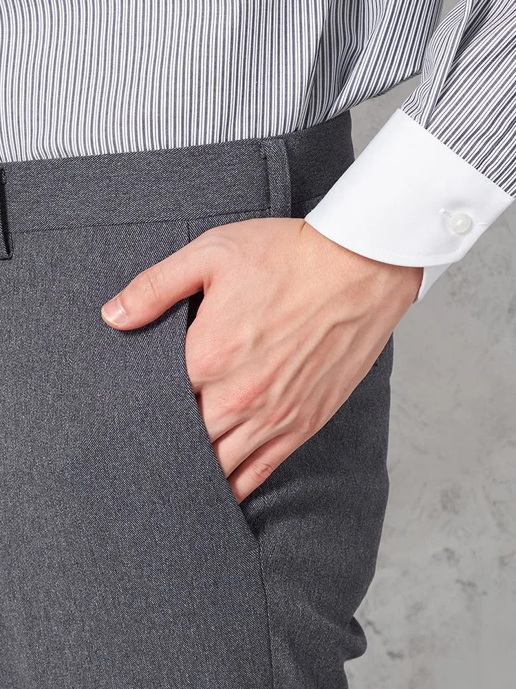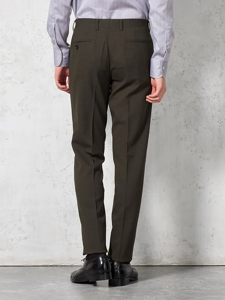 パンツの腰回りに生地の折り込みがなく、スッキリとしたシルエットを実現します。シンプルで洗練された印象を与え、すっきりとした着こなしが可能です。
