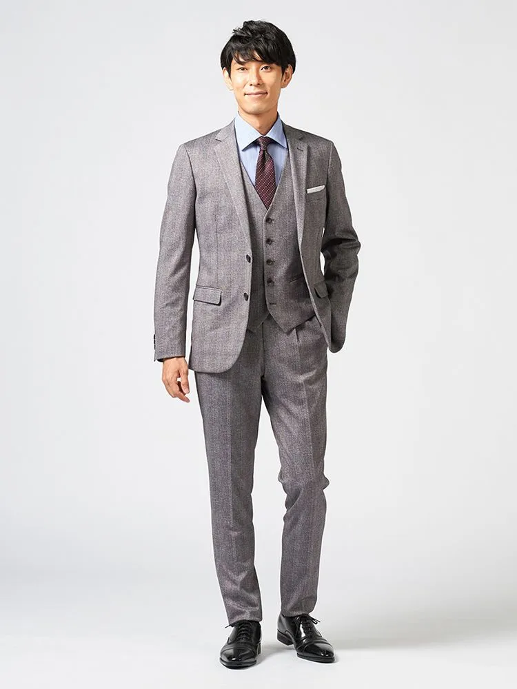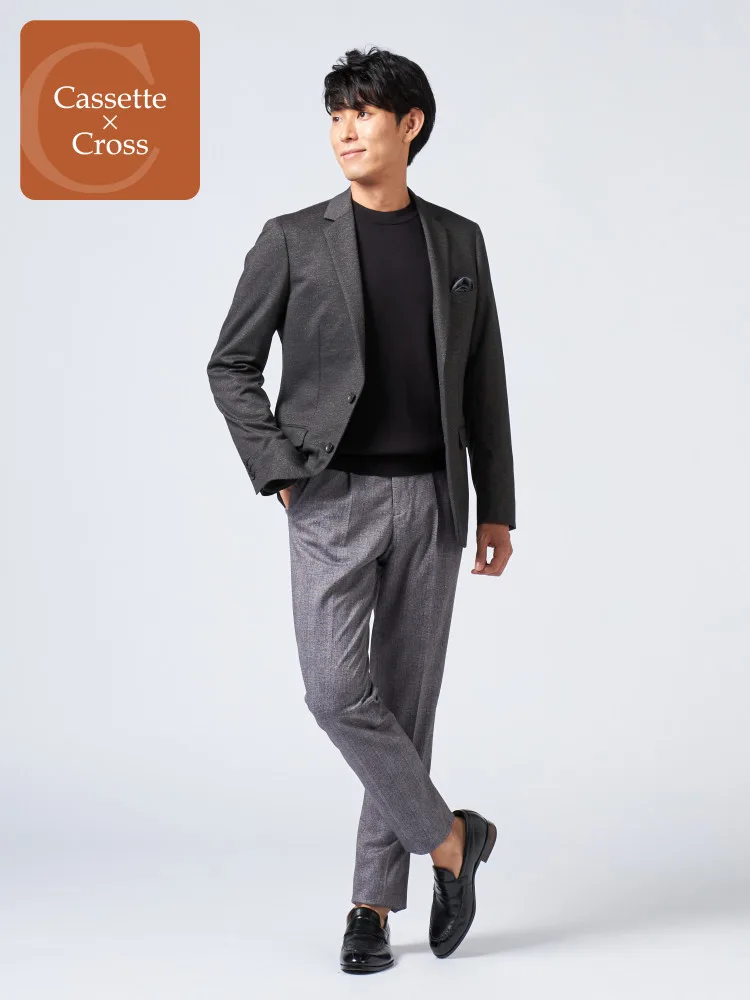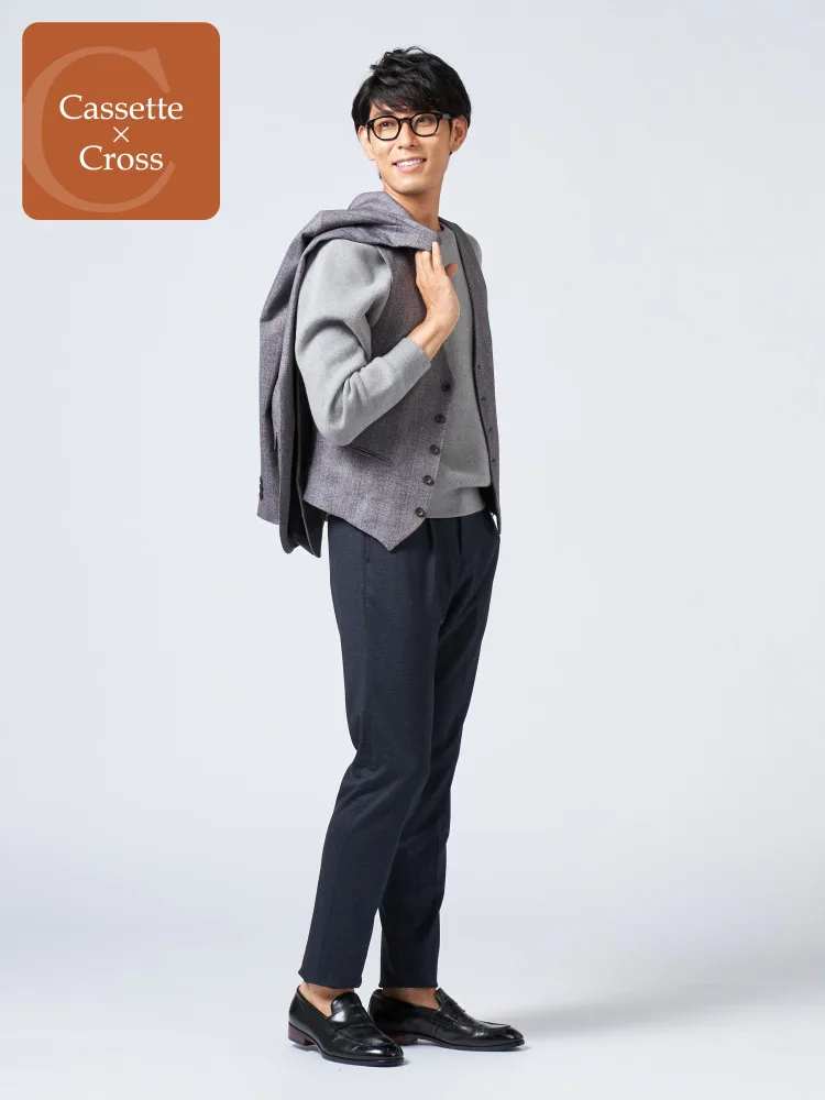 シリーズ内で簡単にコーディネートが楽しめる『Cassette Cross-カセットクロス-』ベスト付きのスリーピーススーツです。
