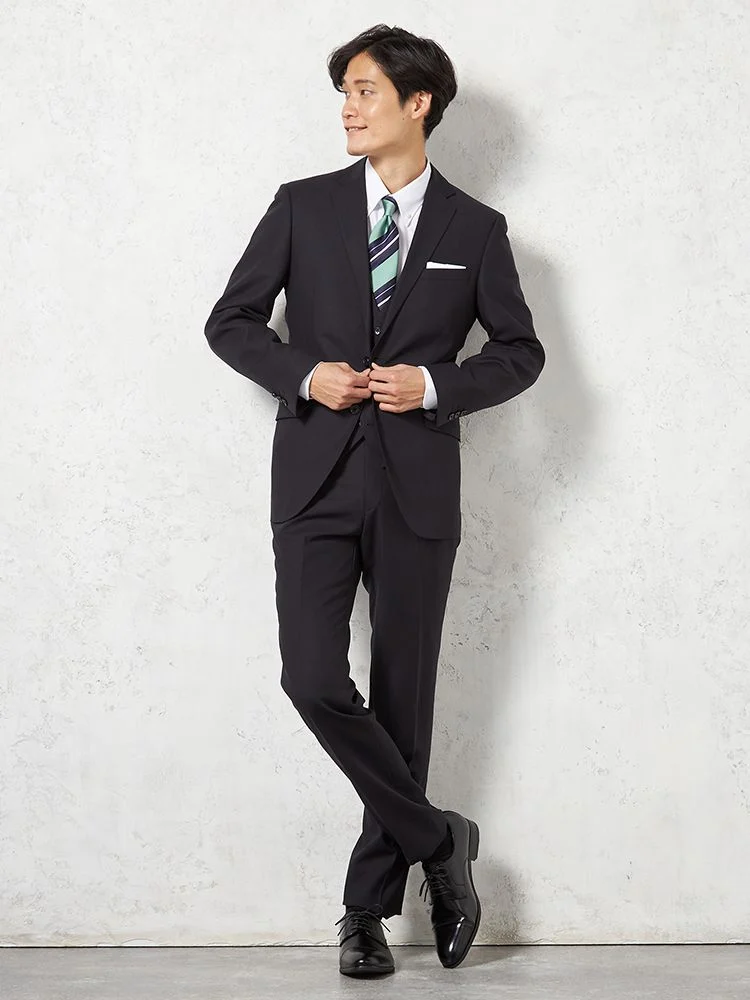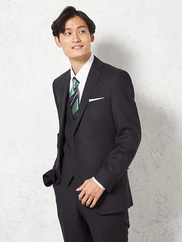 ジャケット、パンツ、ベストの3点セットで、スーツ全体を簡単にコーディネートできます。ビジネスやフォーマルな場面に最適です。