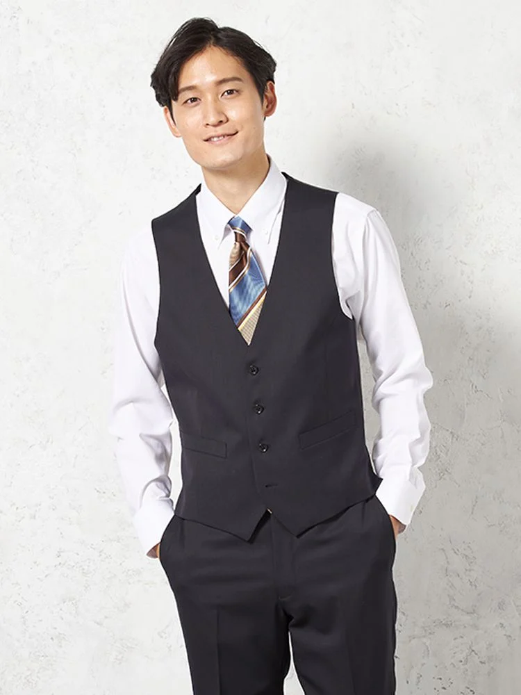 ジャケット、パンツ、ベストの3点セットで、スーツ全体を簡単にコーディネートできます。ビジネスやフォーマルな場面に最適です。