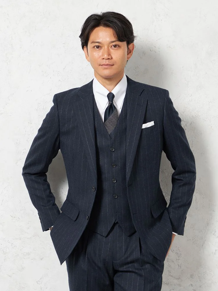 【上下ウォッシャブル】スリーピーススーツ2つボタン軽量ミルドストレッチチョークストライプリッケンバッカー秋冬