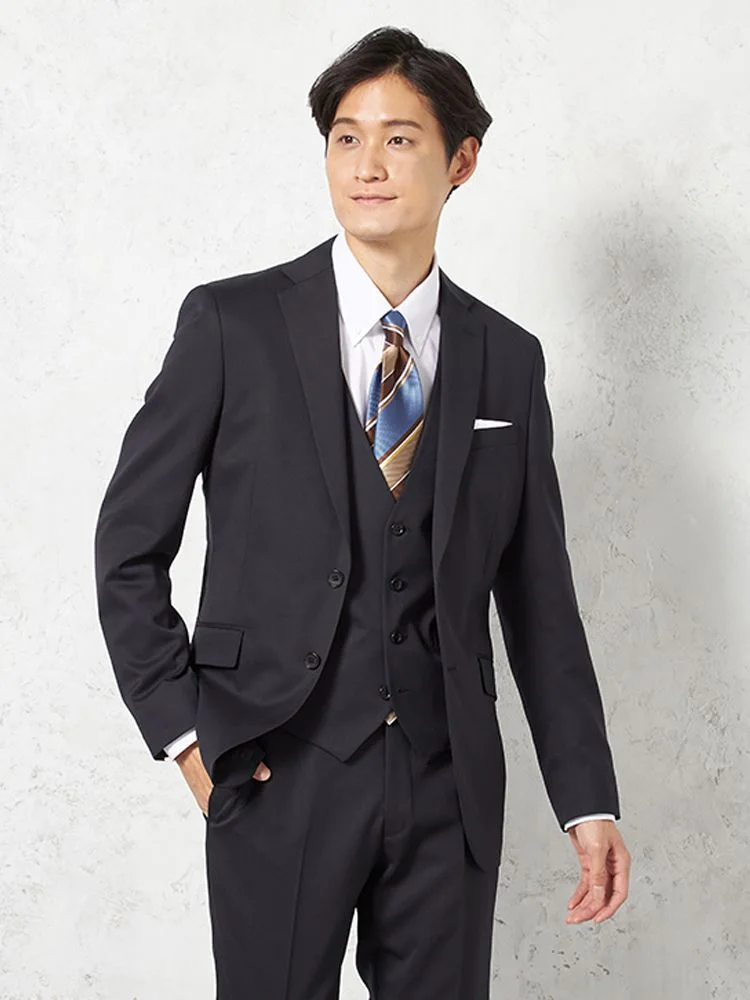 【即納】スリーピーススーツ2つボタン【WEB限定】上下ウォッシャブルブラックシャドウストライプ3シーズン対応