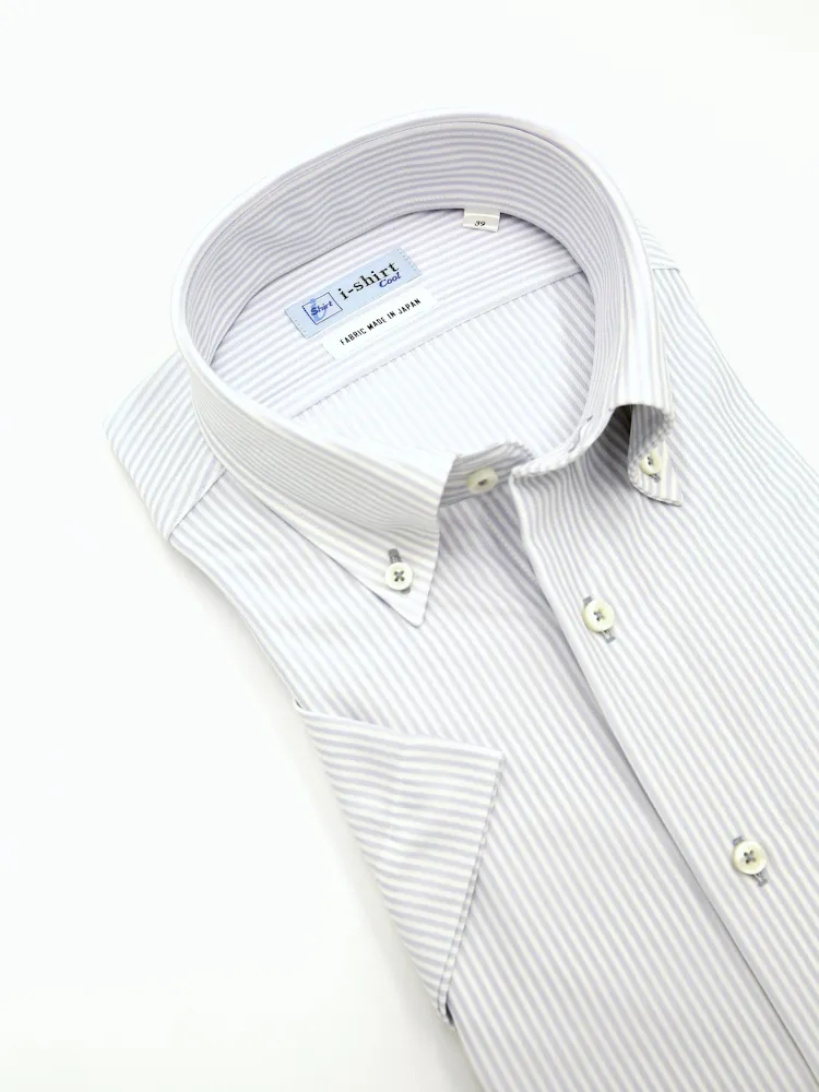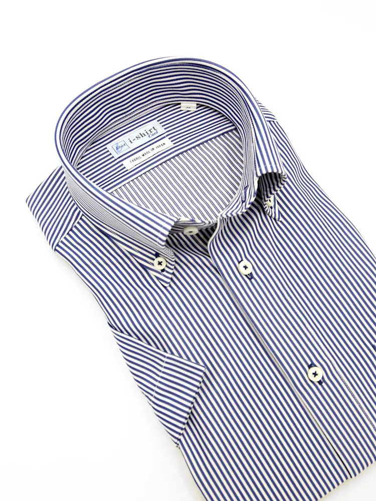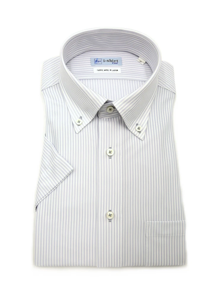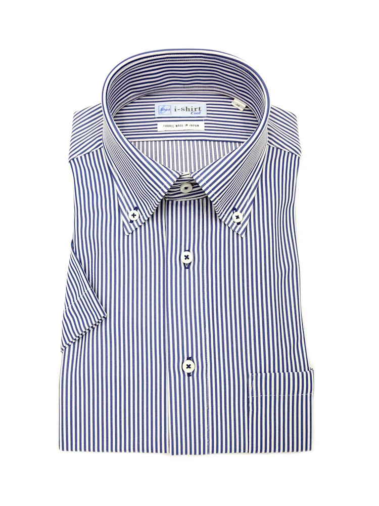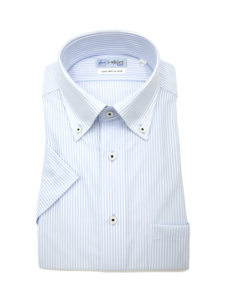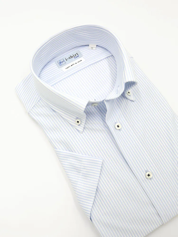 【完全ノーアイロン】半袖 アイシャツ ボタンダウン【バイオセンサークール生地使用】高通気 冷感 ストライプ ワイシャツ i-shirt 春夏(サックス)