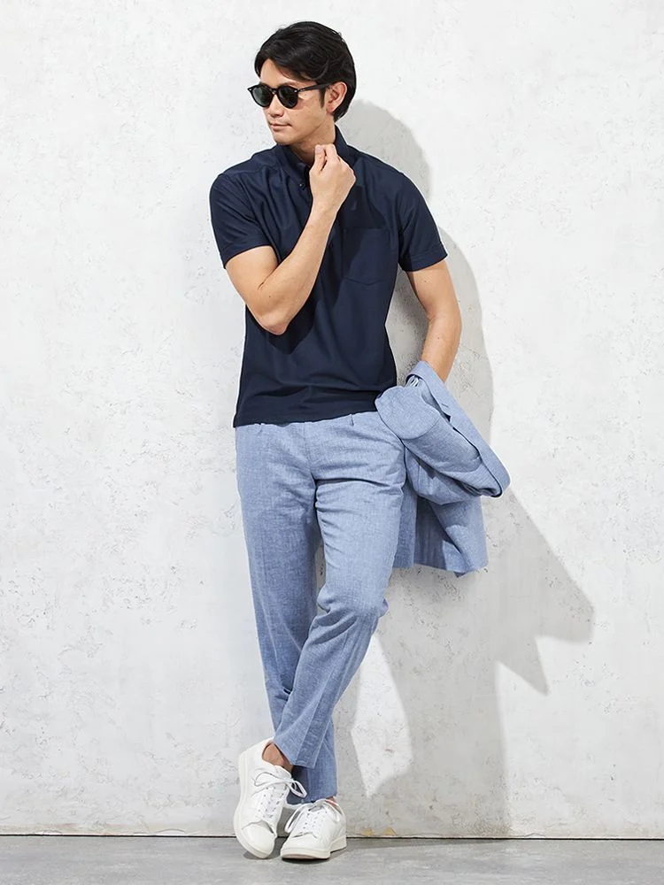 スラックスはワンタック入りで腰回りにゆとりがあります。