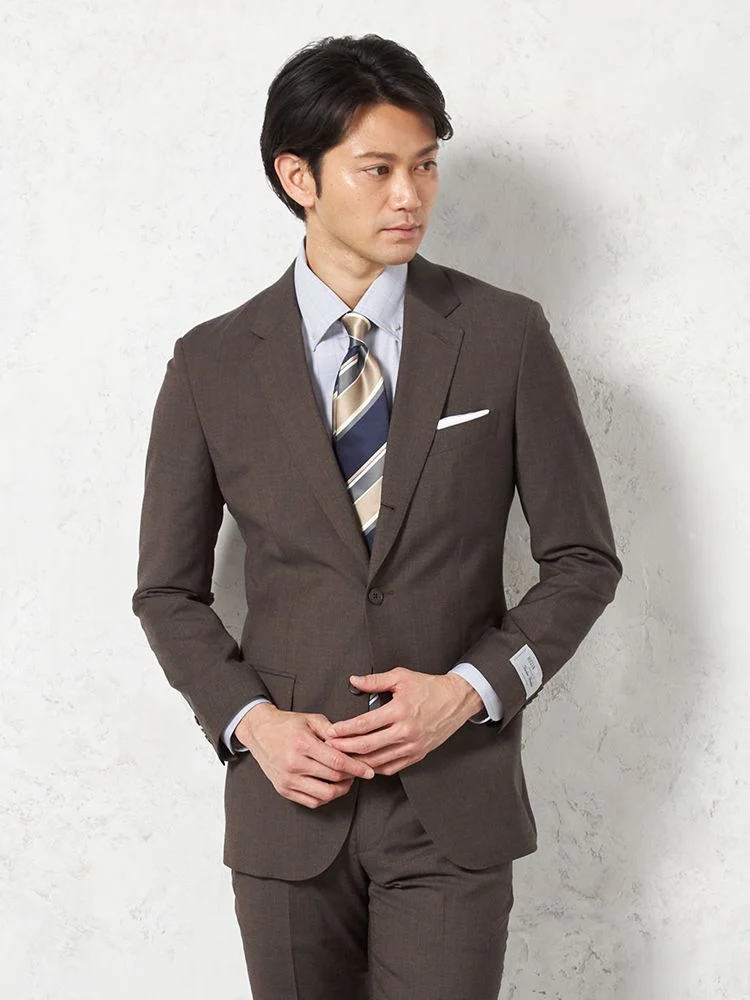【パンツウォッシャブル】スーツ 段返り3つボタン 尾州素材 麻混 ライトフィール ストレッチ 織柄無地 リッケンバッカー 春夏(ブラウン)