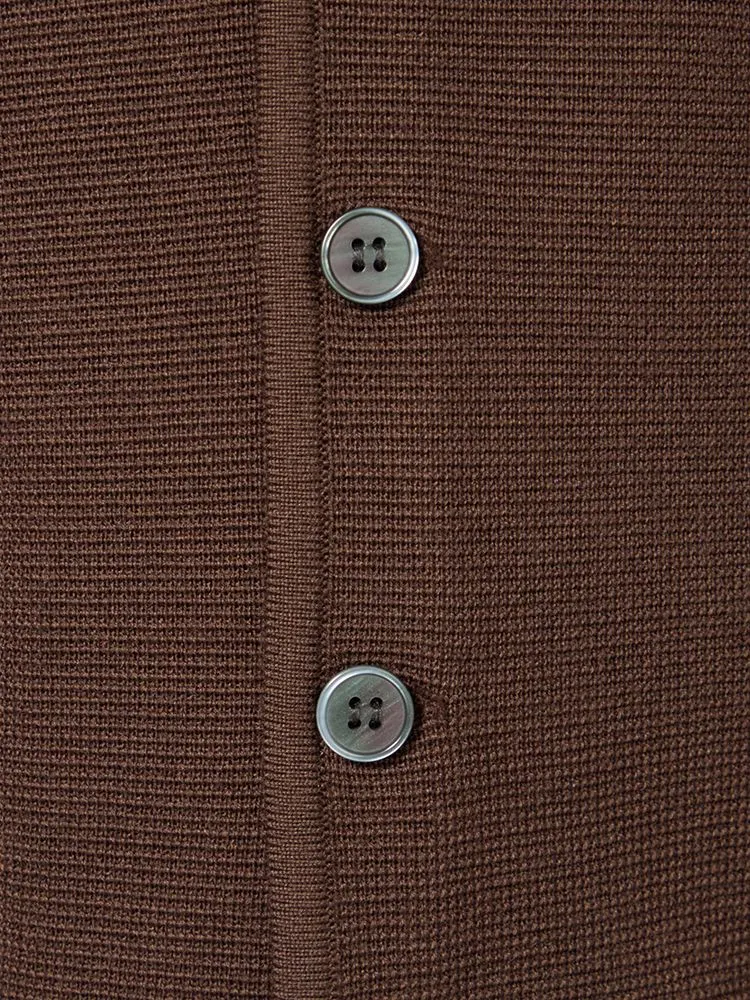 ニット素材ながら、しっかりとした素材感とボタンディテールでエレガントな印象を引き立てます。