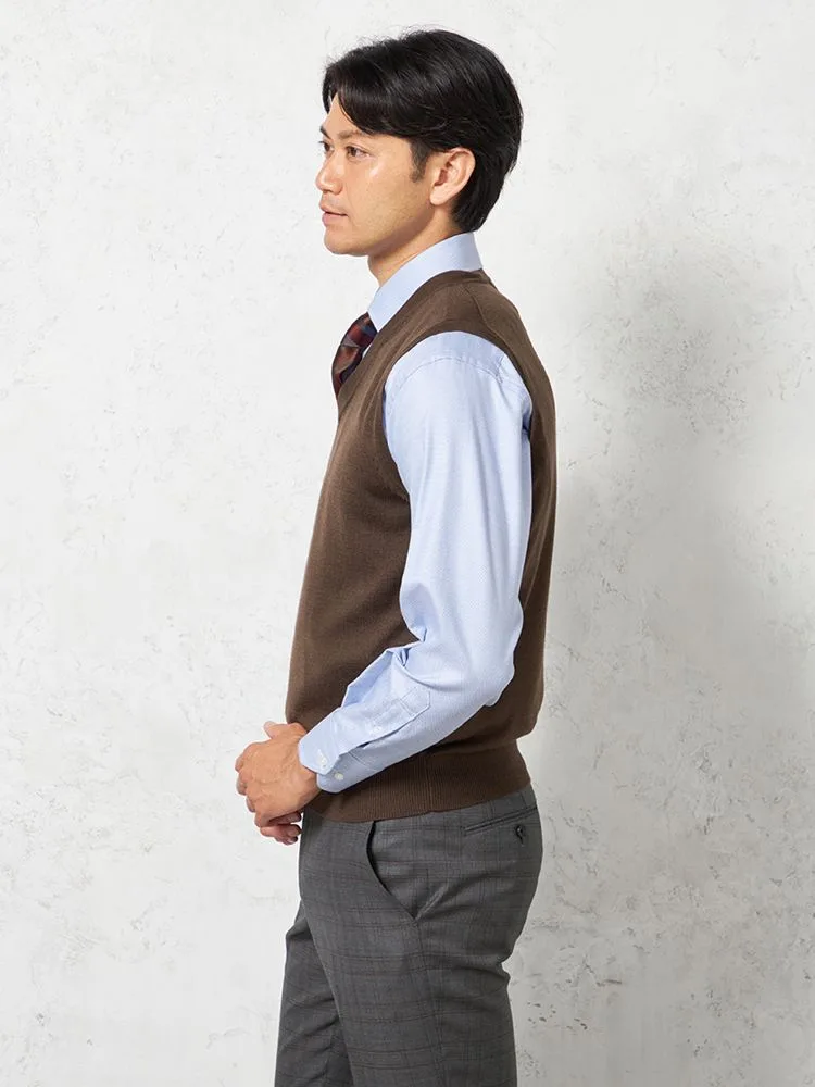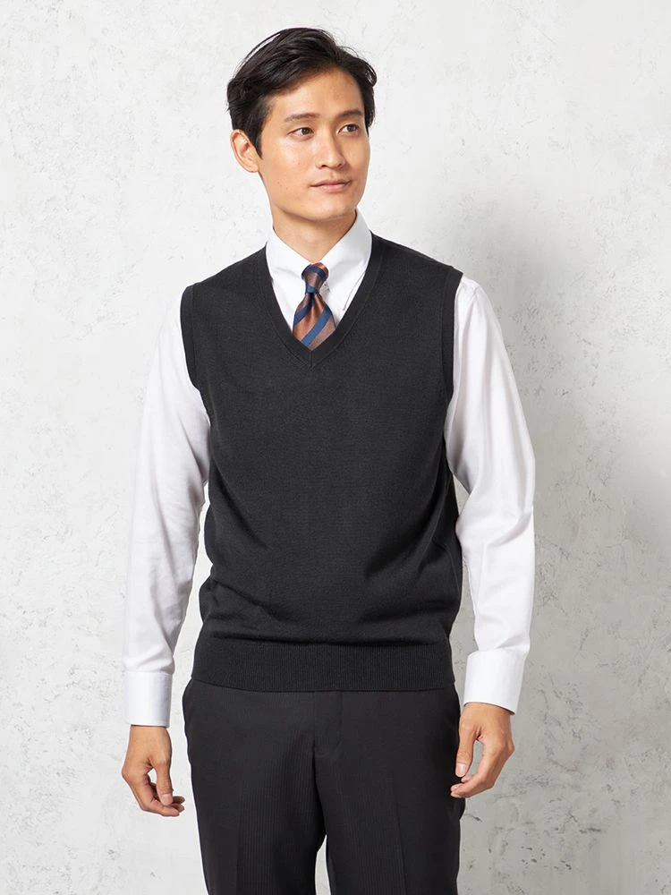 肌寒い日に、スーツの中に重ねやすいVネックのニットベスト。