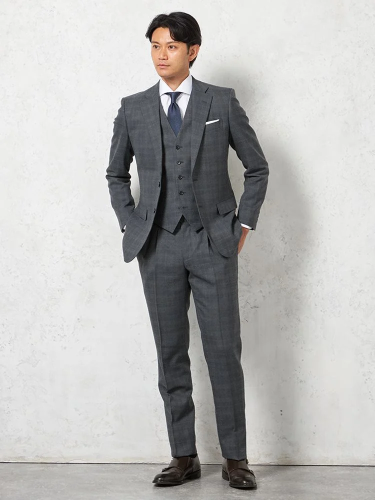 膨らみある三小糸使いで、暖かさと軽さを両立させた素材で仕立てたスリーピーススーツ。