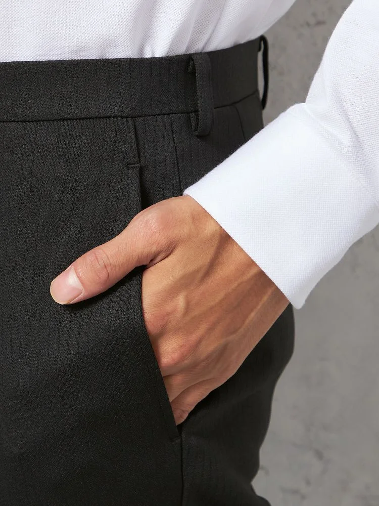パンツの腰回りに生地の折り込みがなく、スッキリとしたシルエットを実現します。シンプルで洗練された印象を与え、すっきりとした着こなしが可能です。