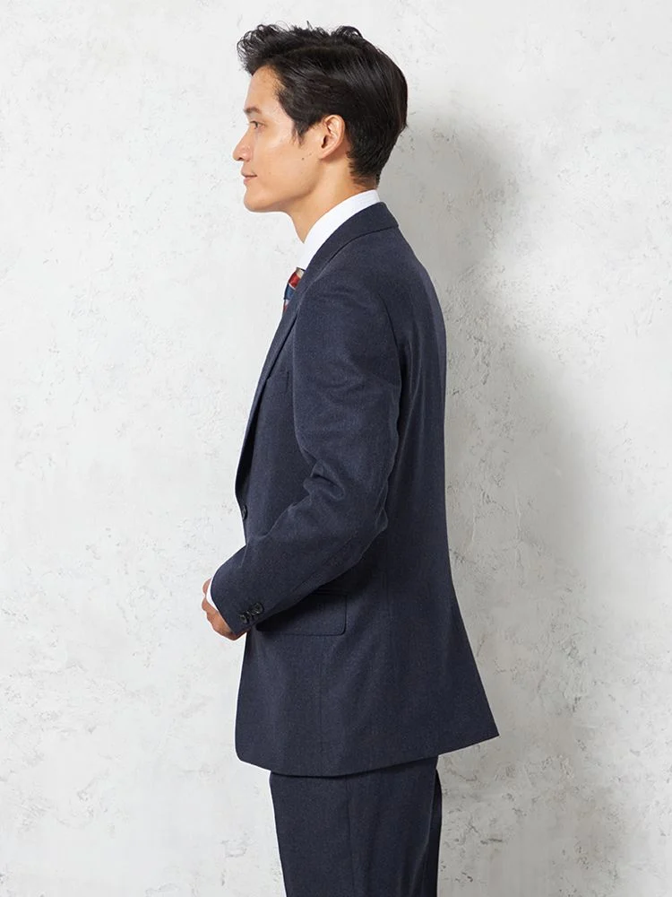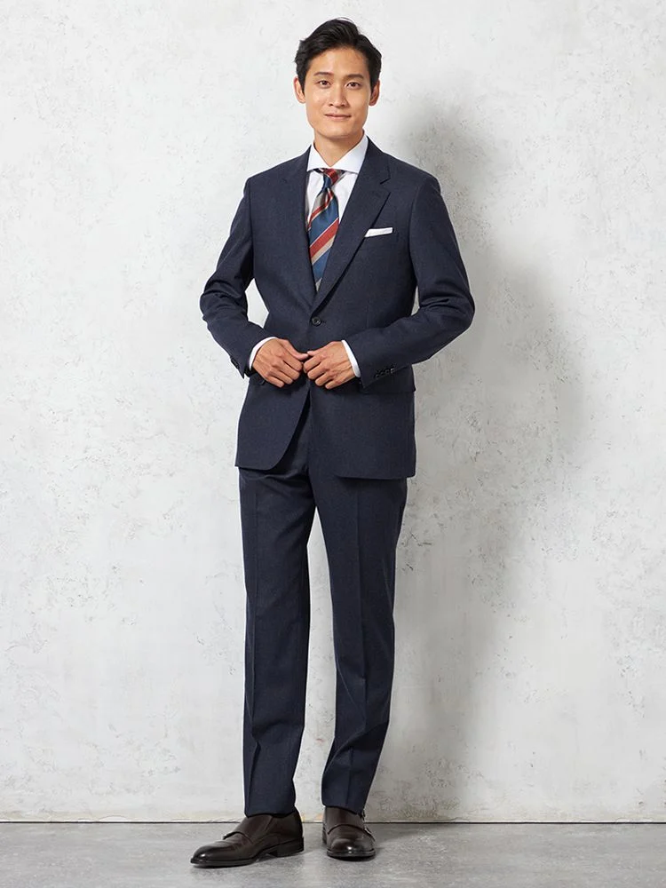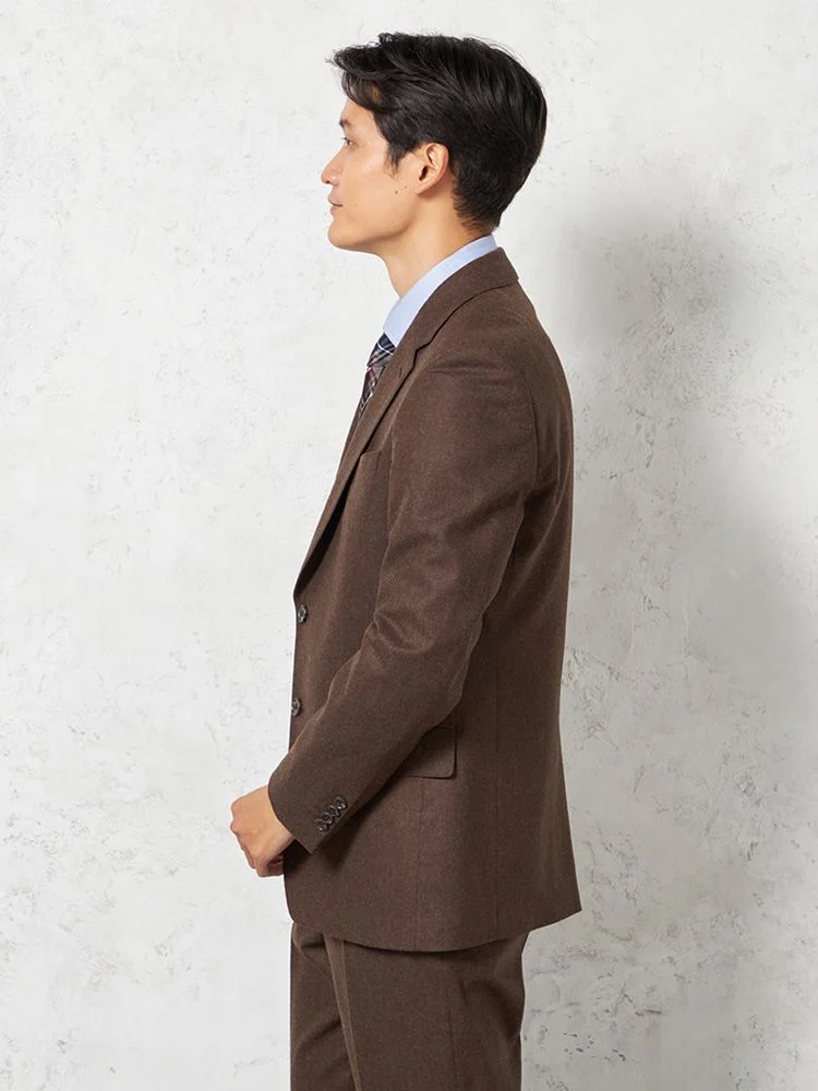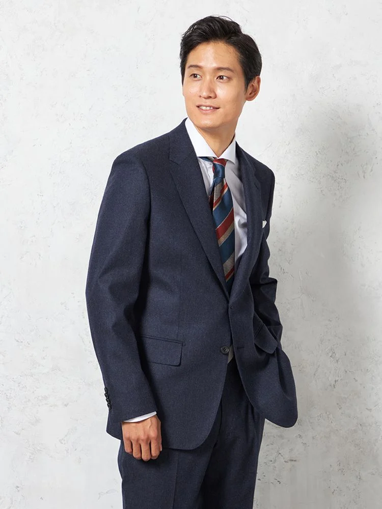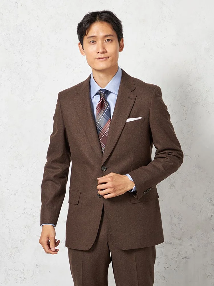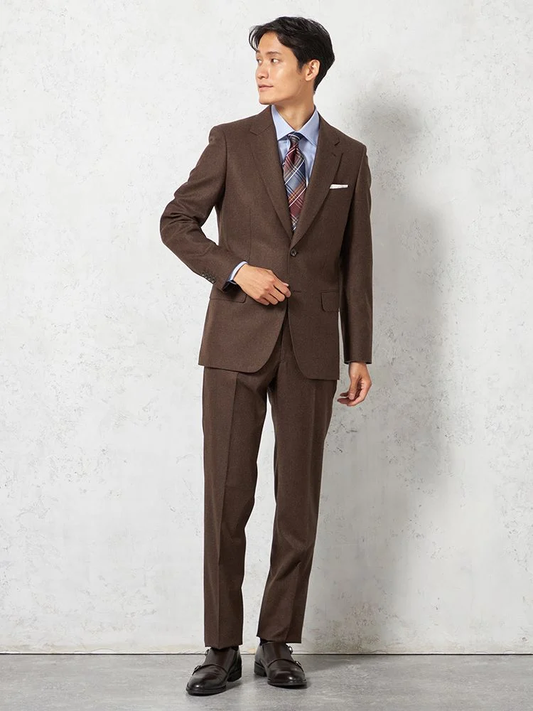 フェルトのような起毛感を持つ、温もりのあるイタリアンファブリックを用いた2ピーススーツです。