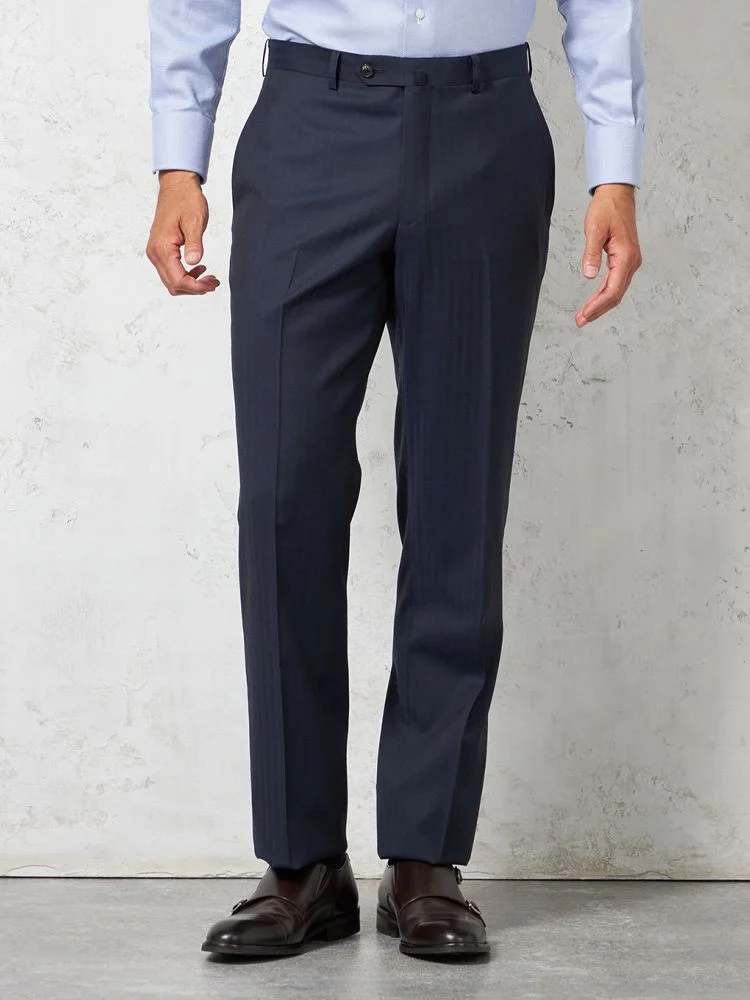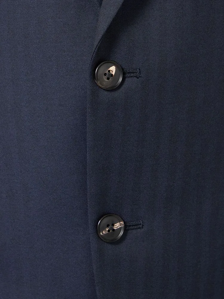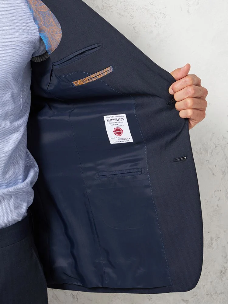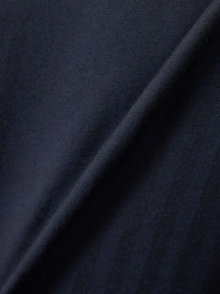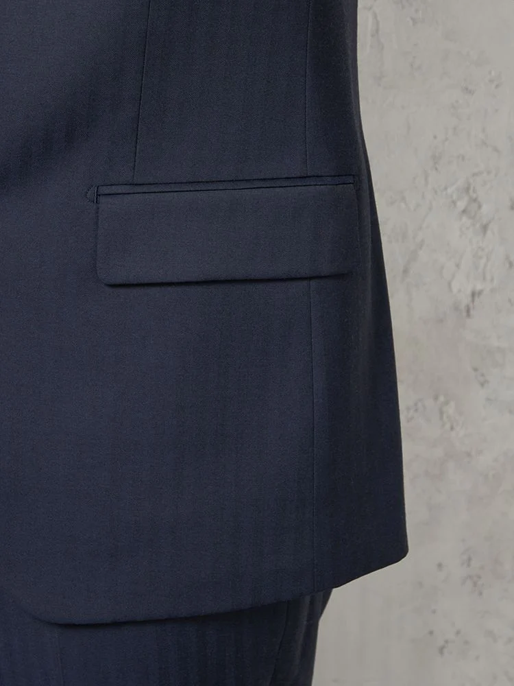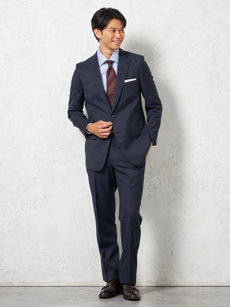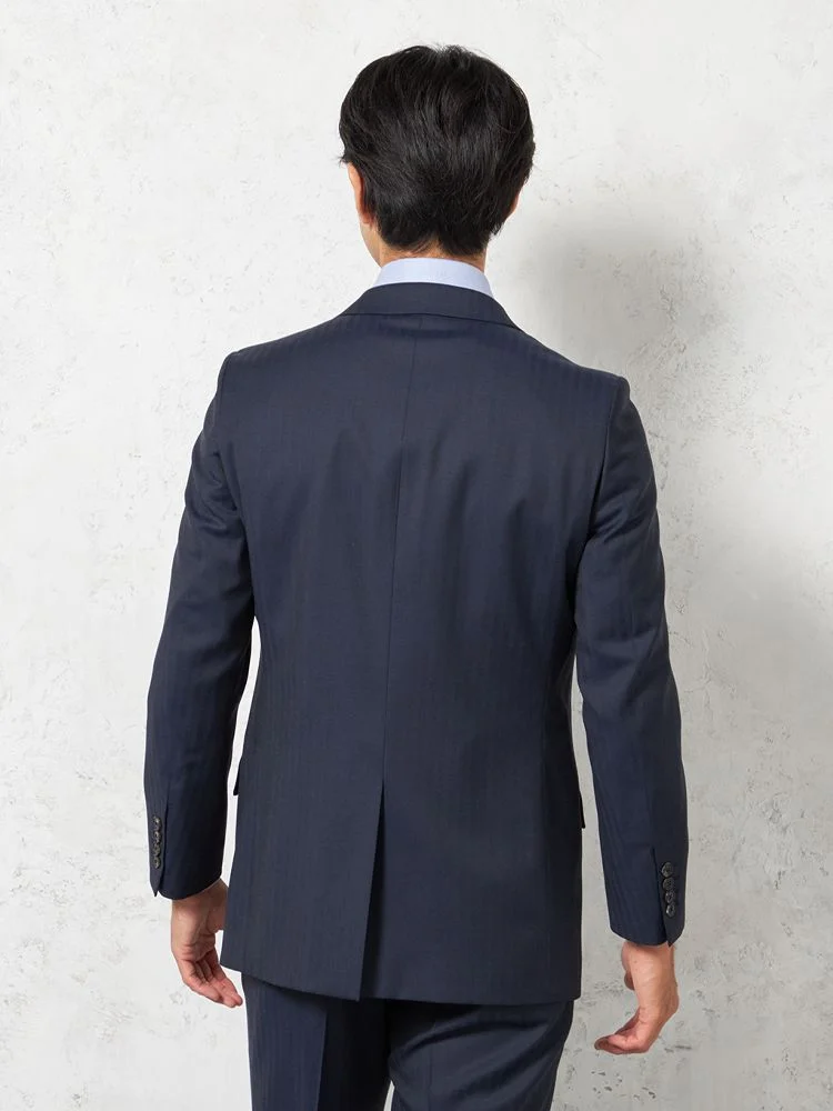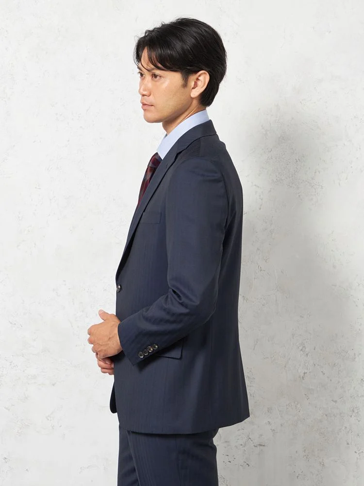 エレガントなネイビー地にヘリンボーン柄が施されたスーツです。。