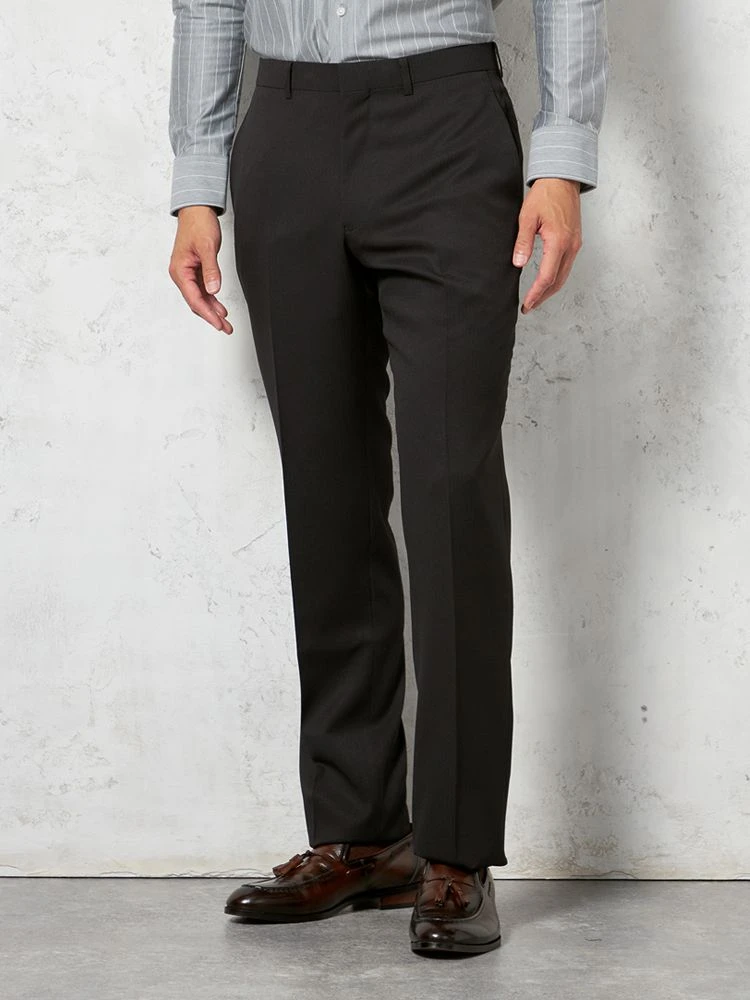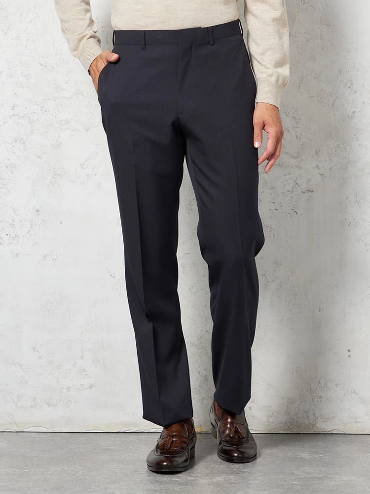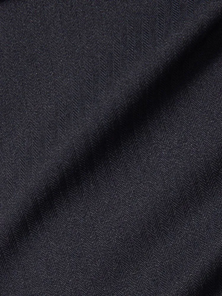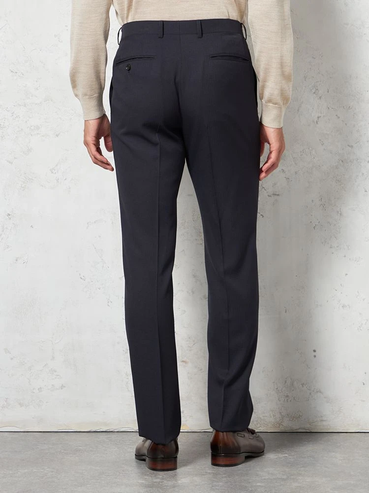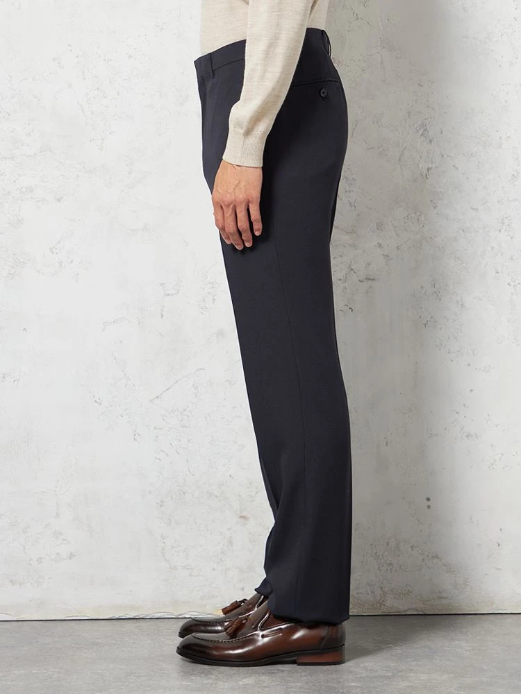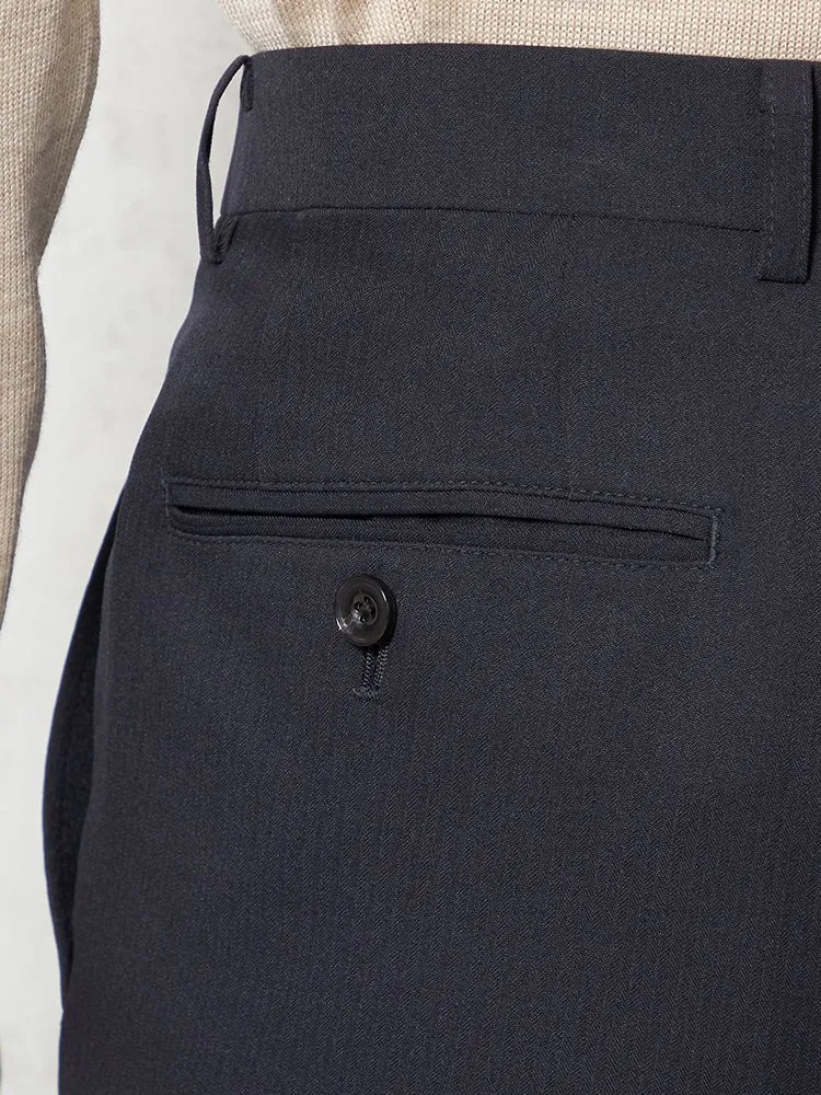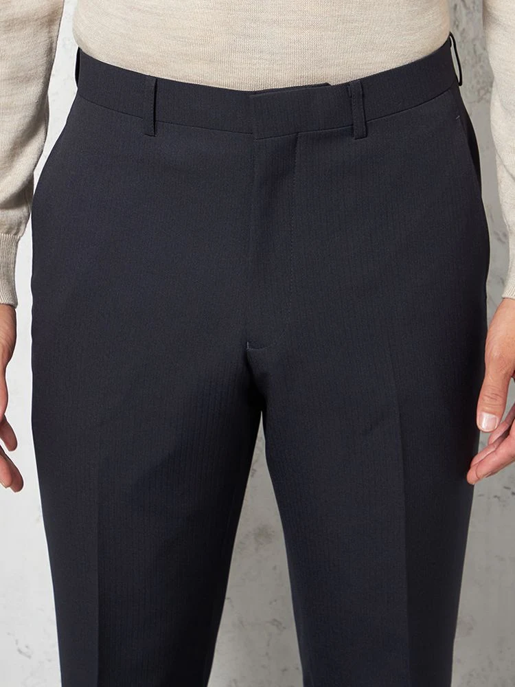 パンツの腰回りに生地の折り込みがなく、スッキリとしたシルエットを実現します。シンプルで洗練された印象を与え、すっきりとした着こなしが可能です。