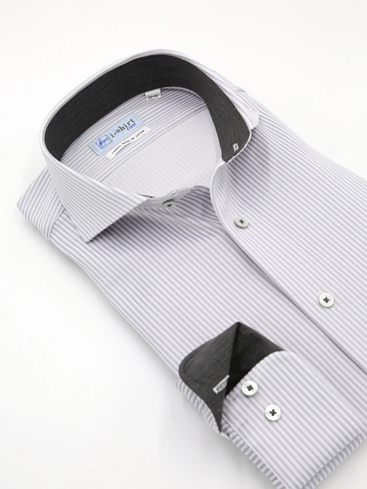 【完全ノーアイロン】長袖アイシャツ カッタウェイ【DRY AIR生地使用】通気性 ストライプ ワイシャツ i-shirt 春夏(L.グレー)