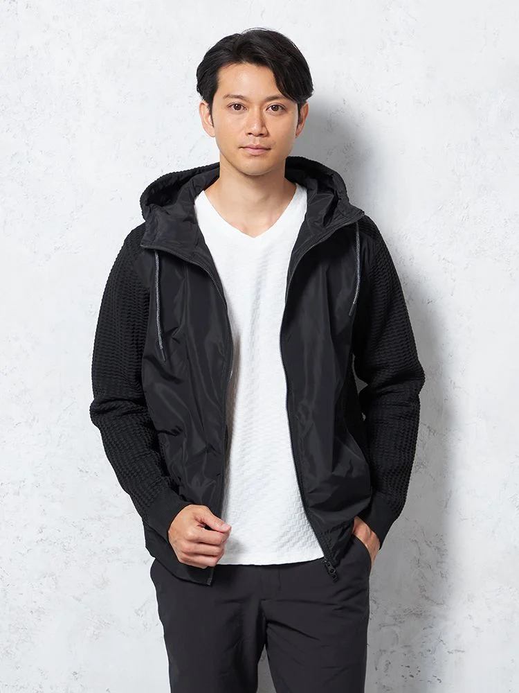 【RUCKEN BACCHAR】ニットコンビパーカー フードブルゾン 無地 カジュアルアウター(ブラック)